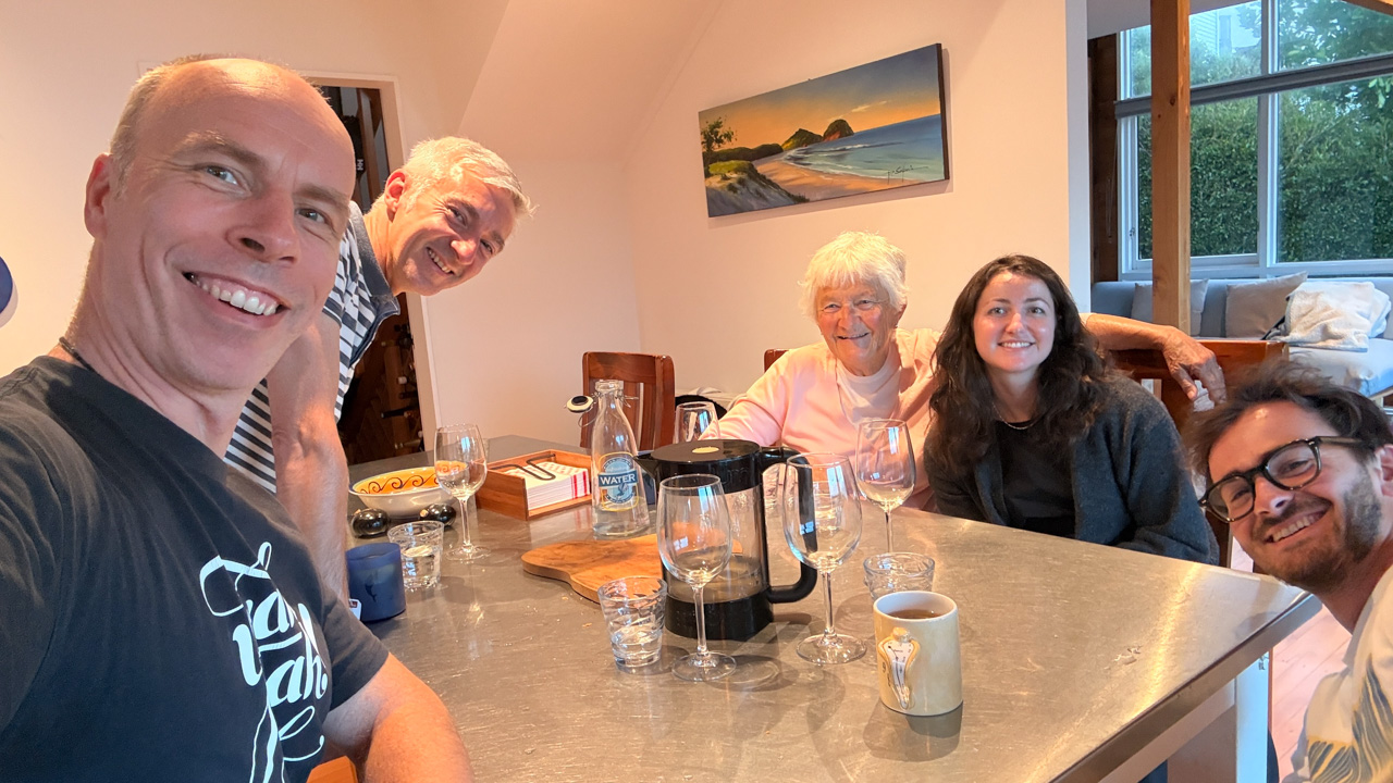 Judith, qui nous avait accueilli a d'Urville, il y a un an, lors d'un hui whakawhanaunga, est de passage a Wellington et est venue diner avec sa fille, Maia.