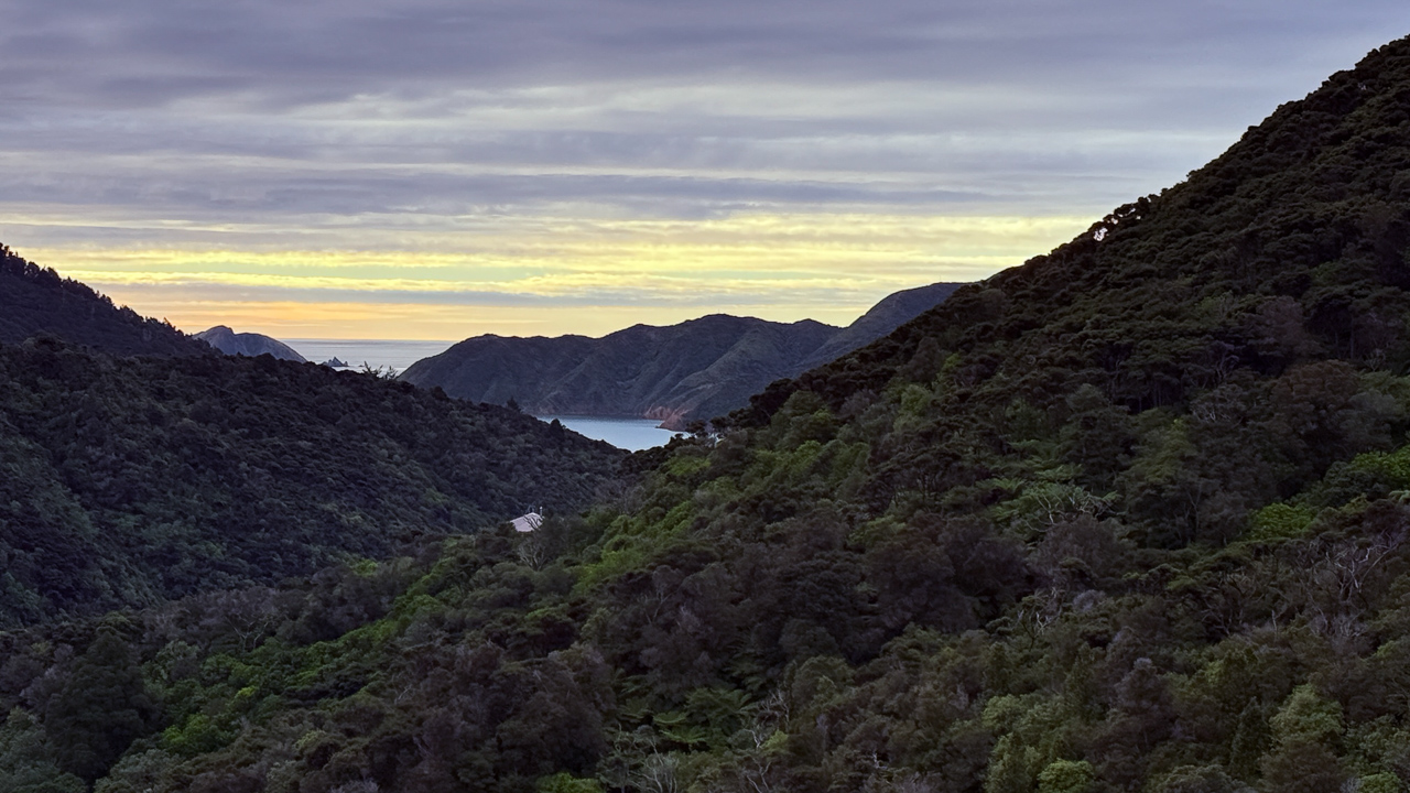 3. Sur la route de d'Urville, les couleurs se rechauffent avec la tombee du jour. Au loin, la silhouette du Taranaki se detache de l'horizon.