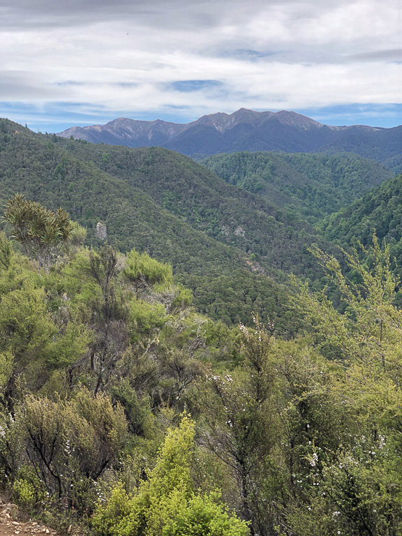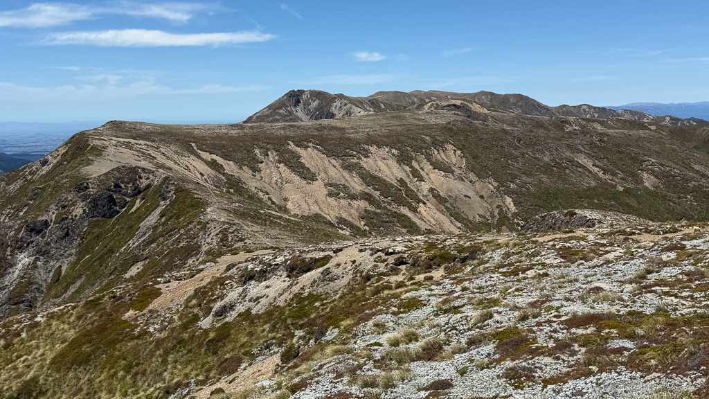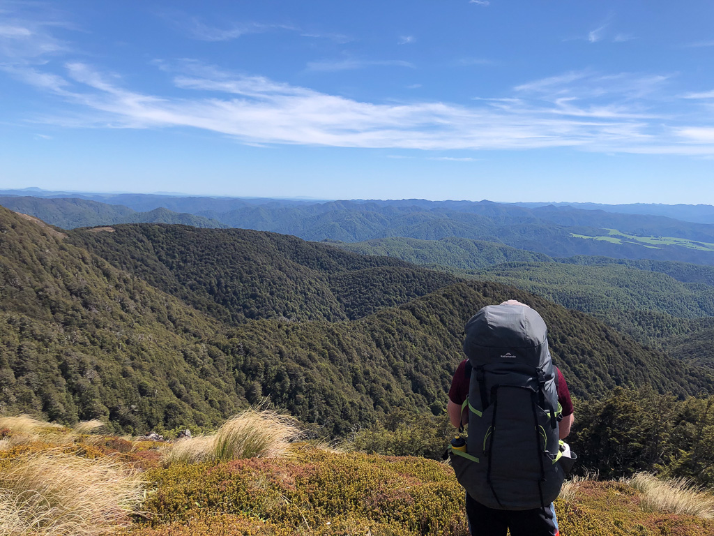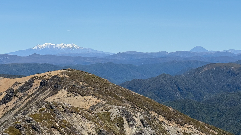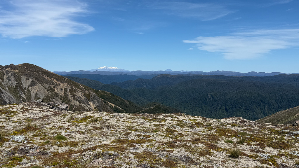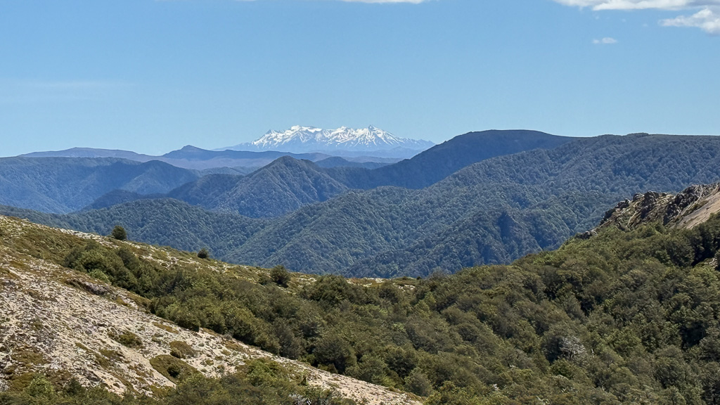 88. Arrive a la crete (~1600m), un panorama de montagnes et de collines, couvertes de foret, se deroule devant nous, et au fond, le Tongariro et Ngauruhoe.