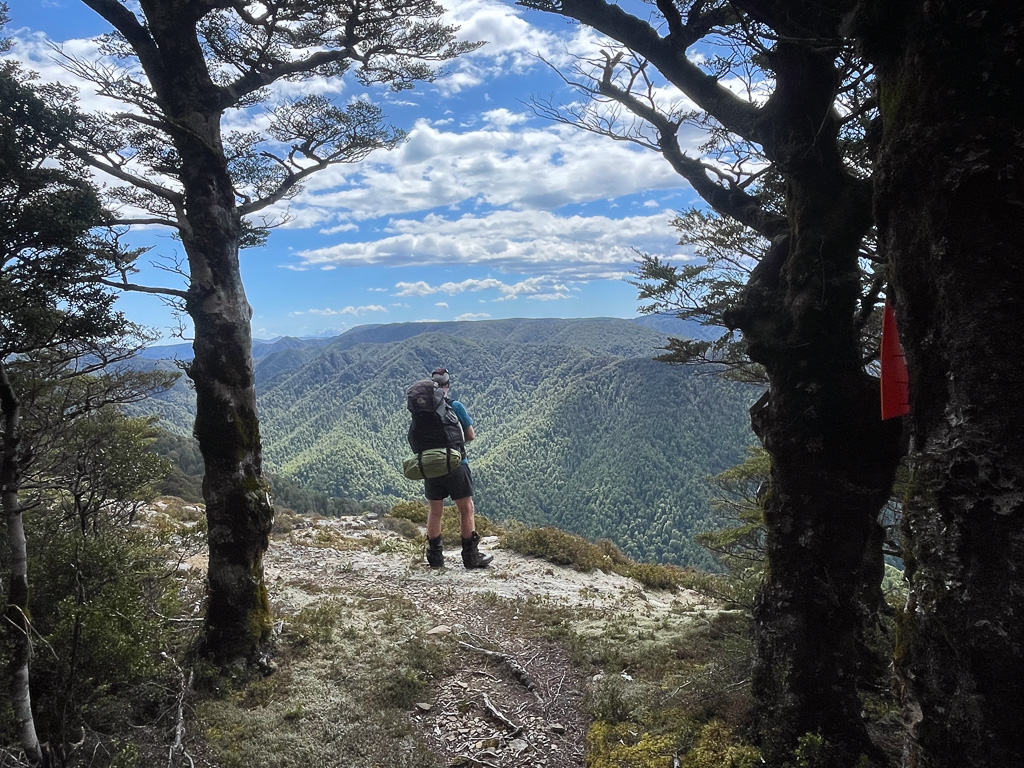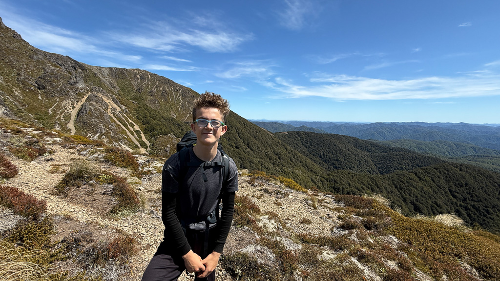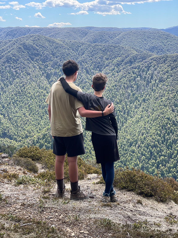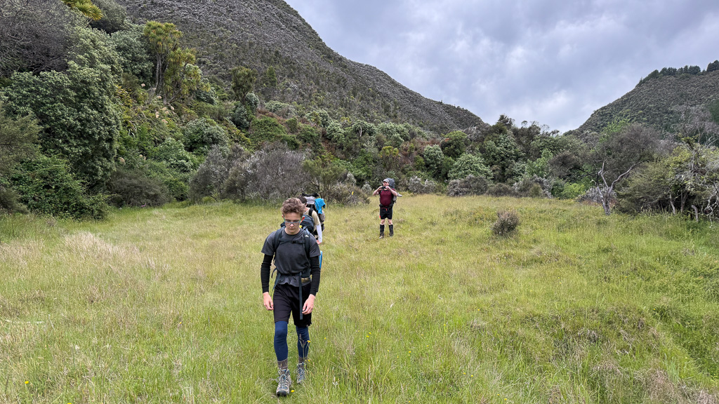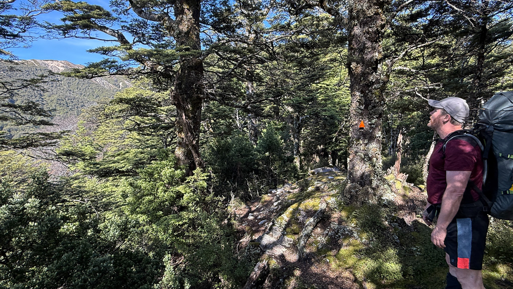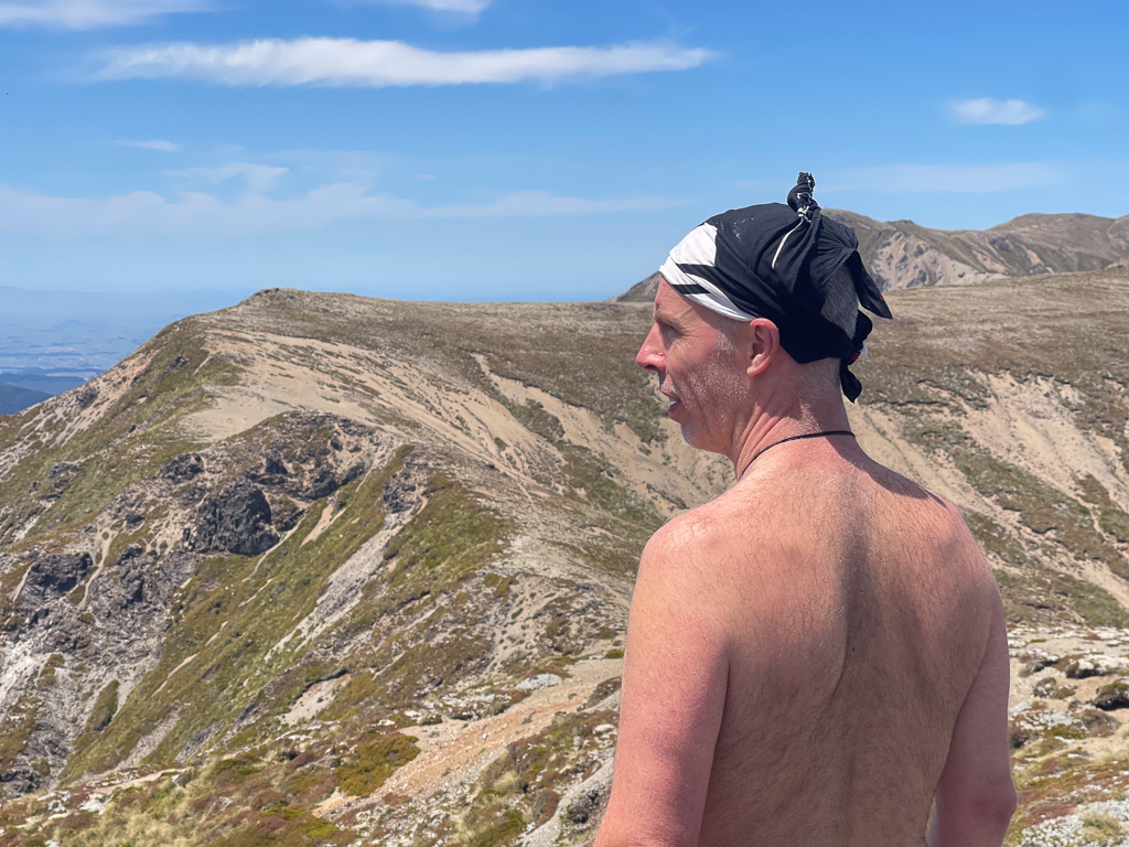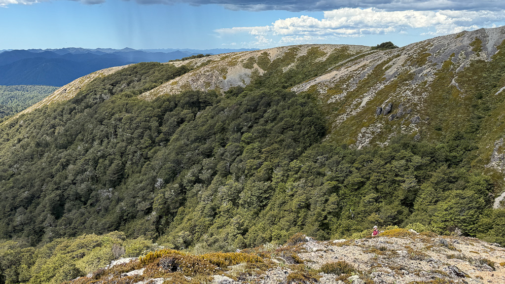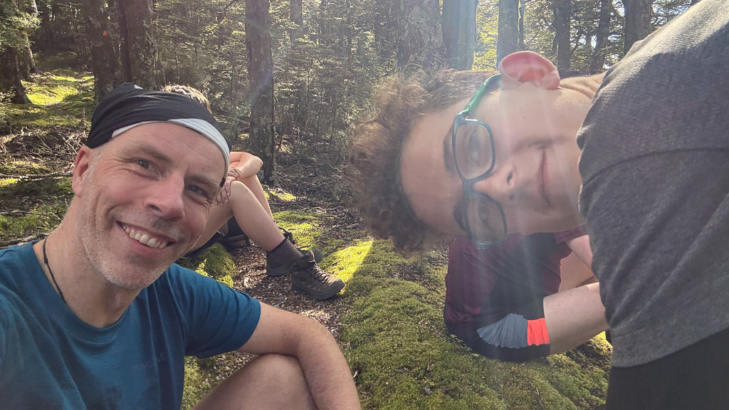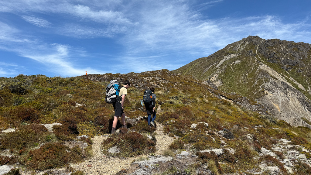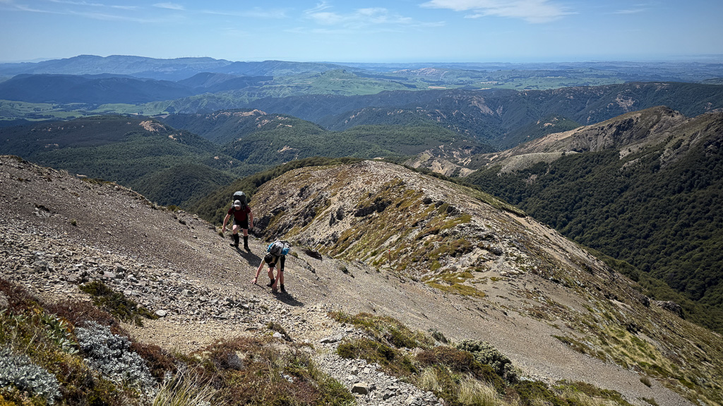 95. Les garcons restent au col, pendant que Mat et moi grimpons les derniers metres pour atteindre Whetu, a 1650m.