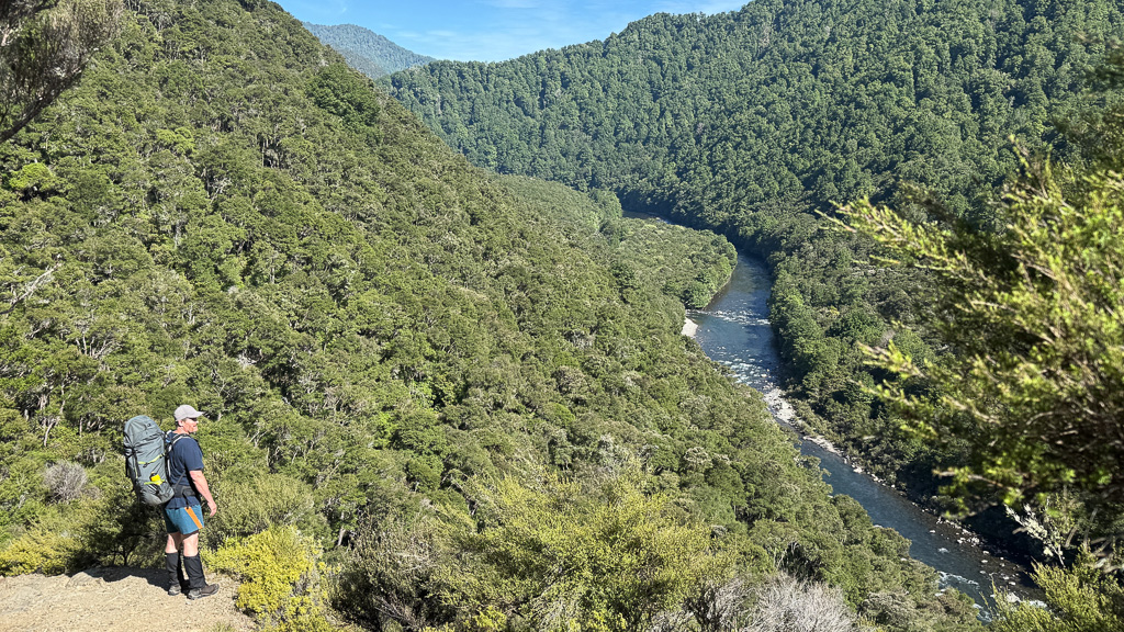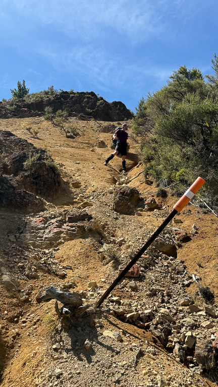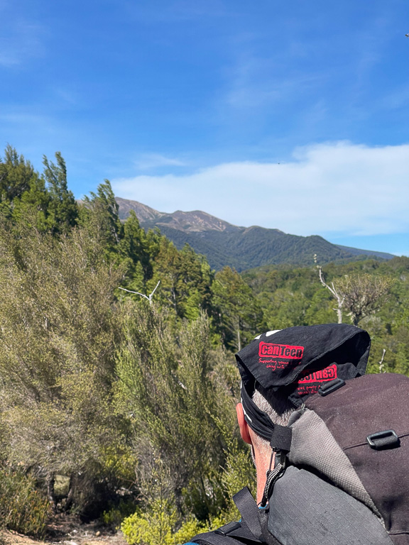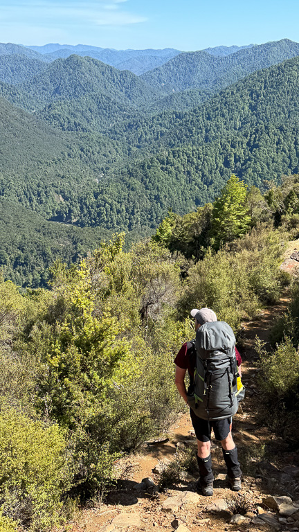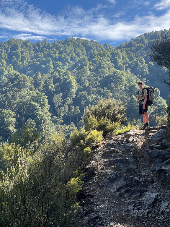 21. Adan grimpe sans la moindre difficulte. Au loin, le sommet de droite, Whetu, ou nous devrions etre dans l'apres-midi.