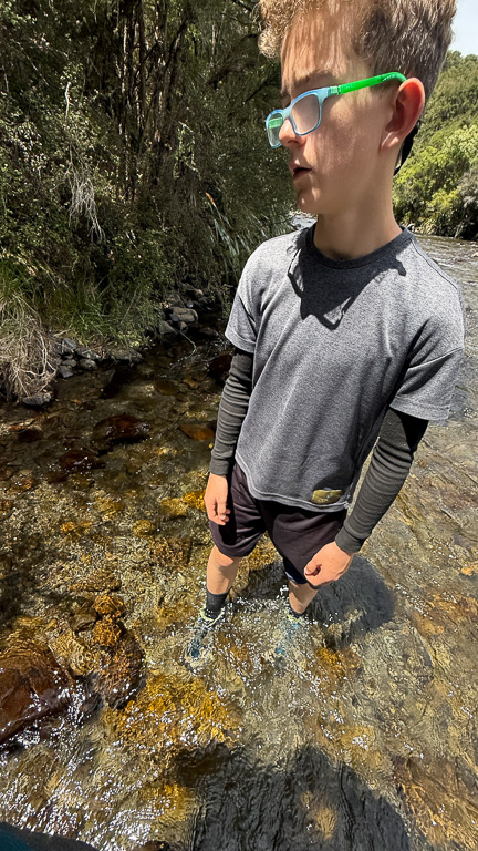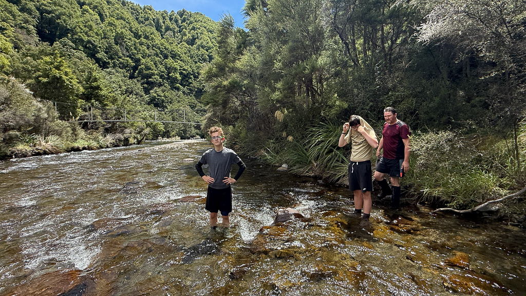168. Midi trente. Nous voila arrives au parking. On enleve nos chaussures, on trouve un trou de riviere pour un brin de toilette ...