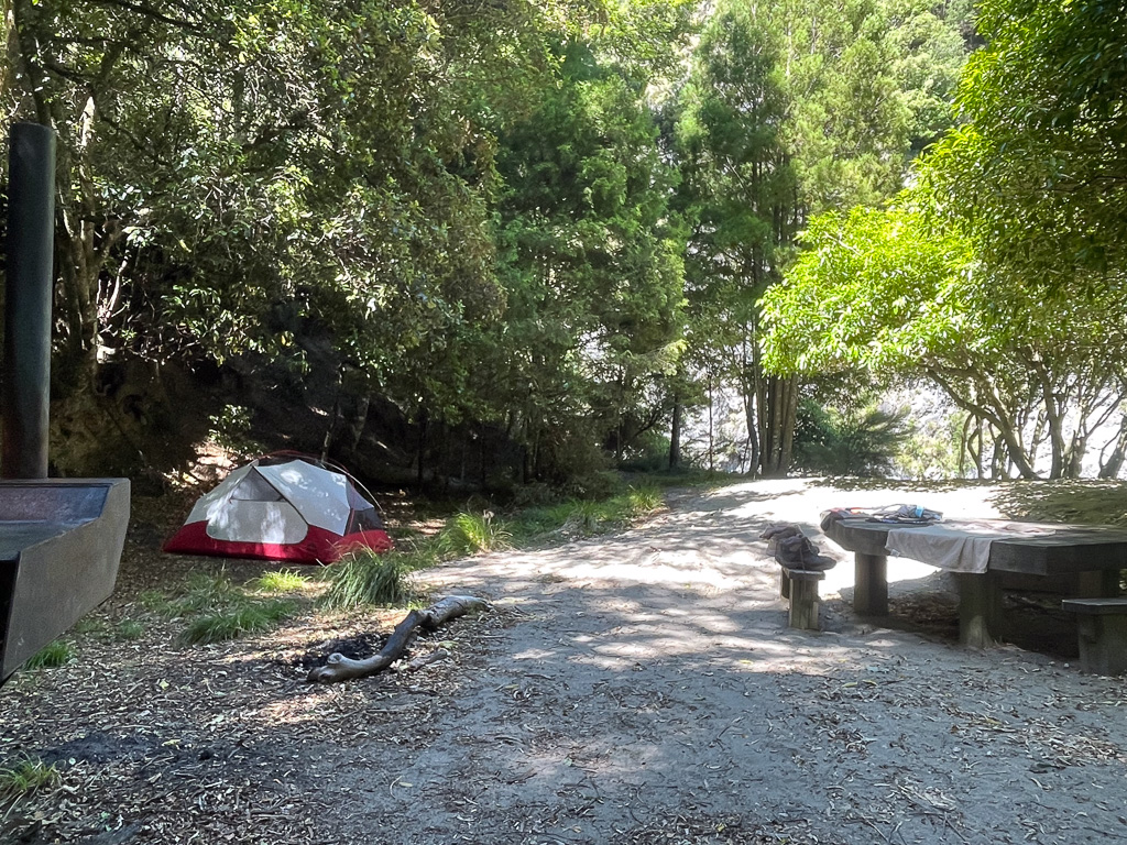 103. Le bivouac est comme prevu, tout petit. Meme s'il y a de l'eau et des toilettes, on voit mal comment on pourrait rester ici: les efforts pour y parvenir ont ete plus importants que prevu, ce qui rendra la marche demain, surement trop difficile.
