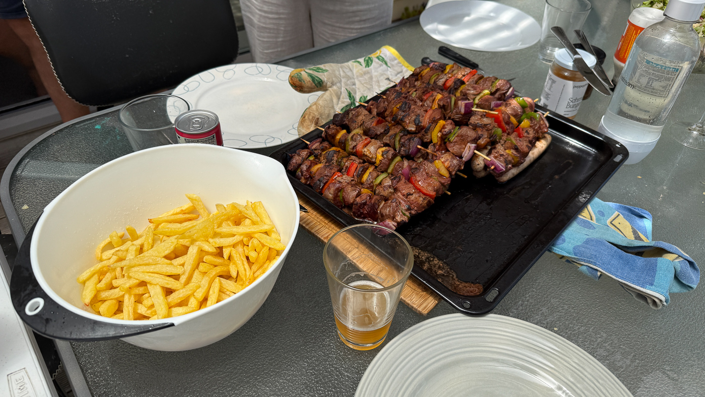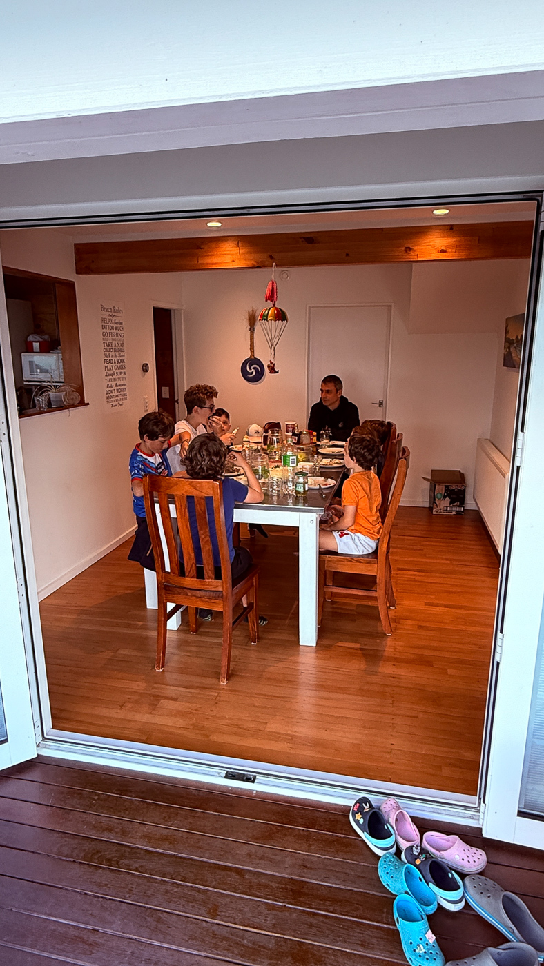 17. 24 Decembre. Cette annee, le reveillon est chez Nico a cause d'un vent trop fort de l'autre cote de la colline. Laurent ramene, entre autres, sa friteuse!