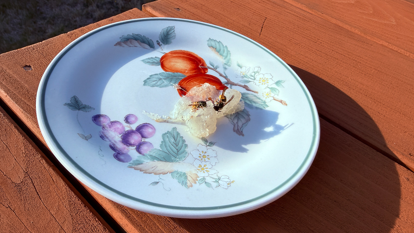 41. Il y a quelques guepes, et chance, elles sont dans leur phase proteines! Demain, ce ne sont pas quelques morceaux de poisson qui leur seront servis, plutot un cadeau empoisonne, litteralement.