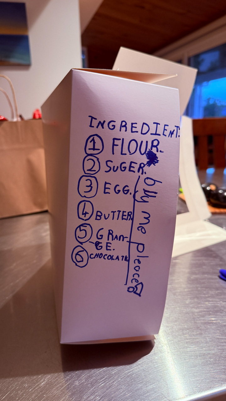 Alors qu'il ecrit les ingredients du gateau que nous avons prepare pour le gala MNS, je constate que l'ecriture de Cosmo est soudainement devenue beaucoup plus appliquee.