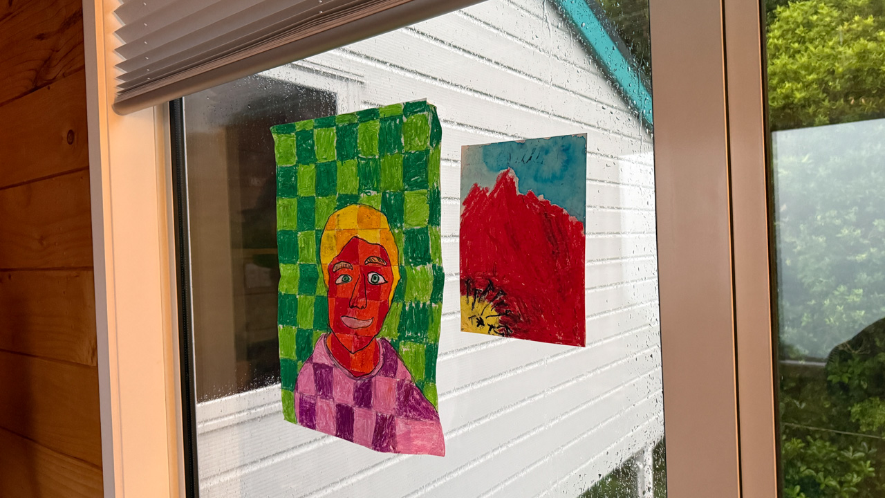 Cosmo est revenu de l'ecole avec quelques artworks ... dont un autoportrait qu'il a accroche sur ma fenetre de bureau!