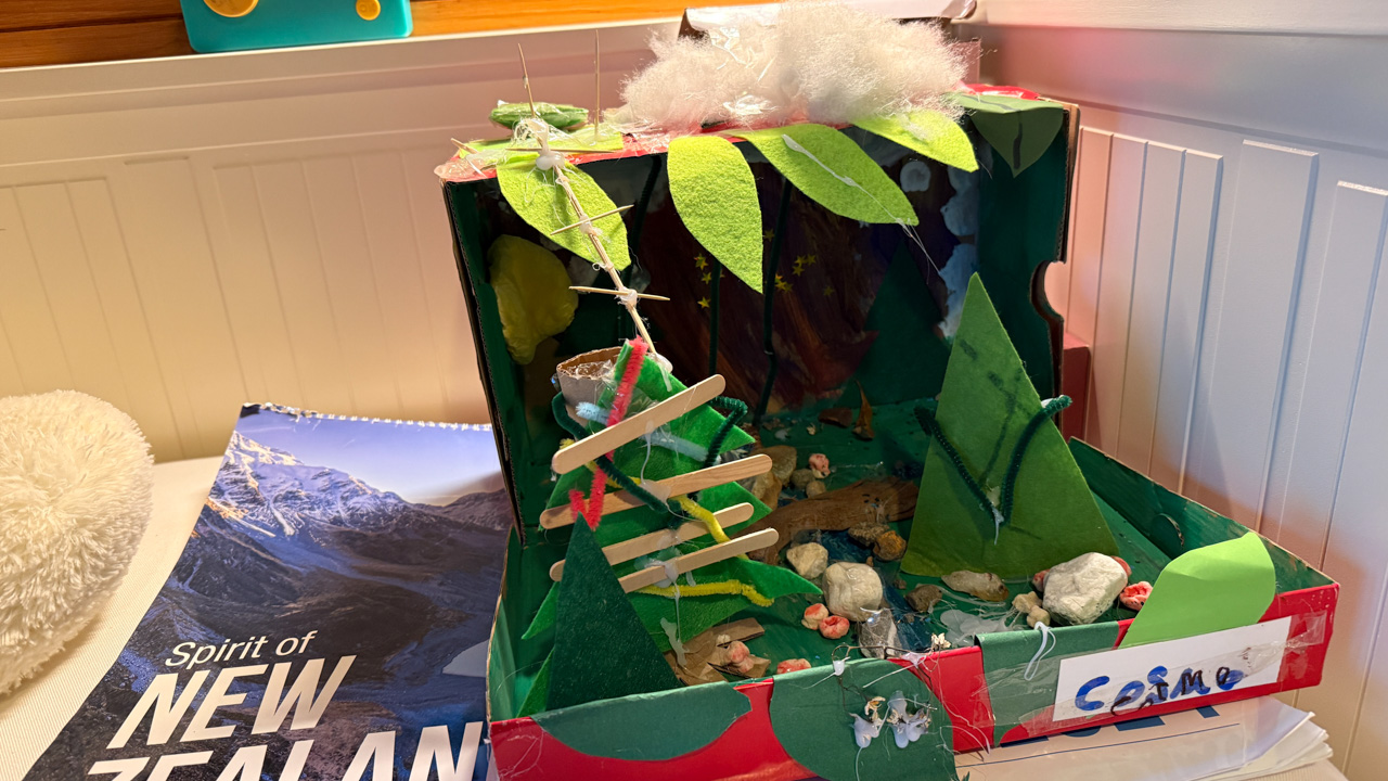 Cosmo est revenu avec ceci de l'ecole aujourd'hui. Ils ont commence, il ya plusieurs semaines, par decrire, avec des mots, leur vision de la foret enchantee. Une AI a ensuite genere l'image sur la base de leur texte. Et c'est sur la base de cette image que les enfants ont du fabriquer leur scene.