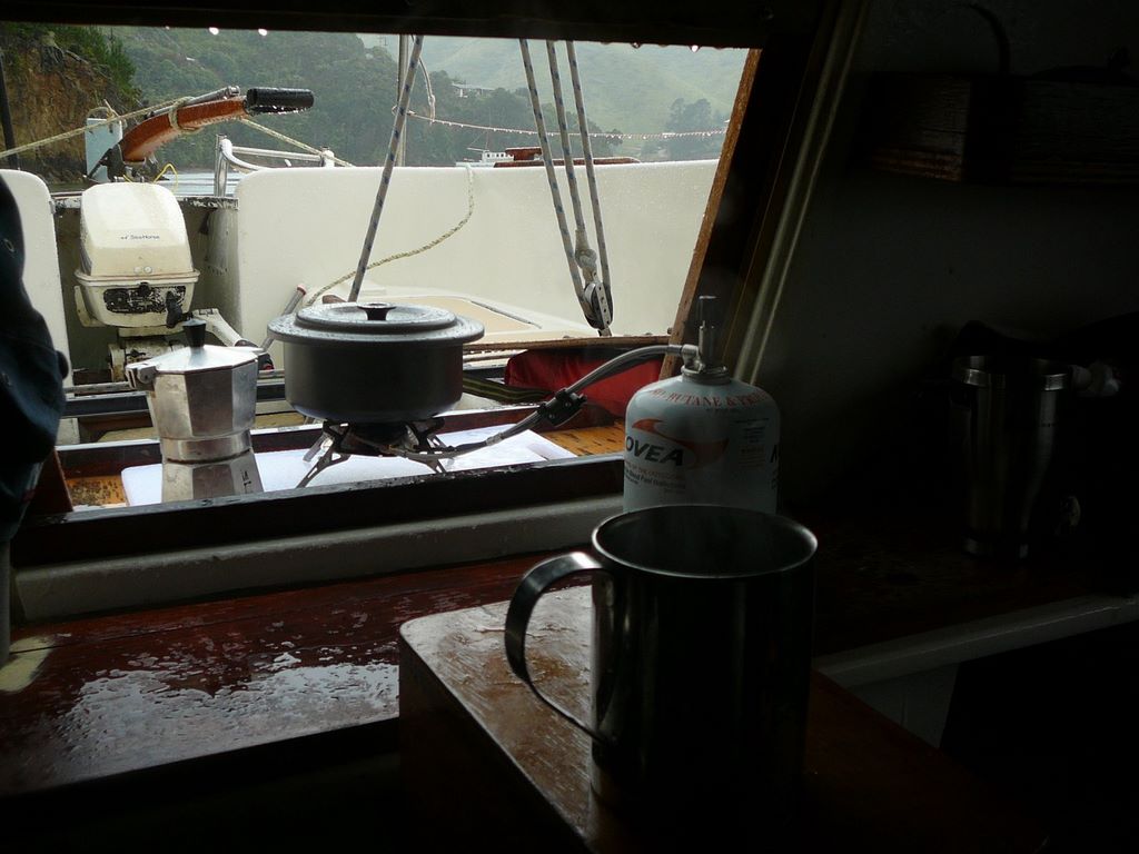 47. Samedi. Il pleut des cordes. Je prépare le café depuis l'intérieur du bateau