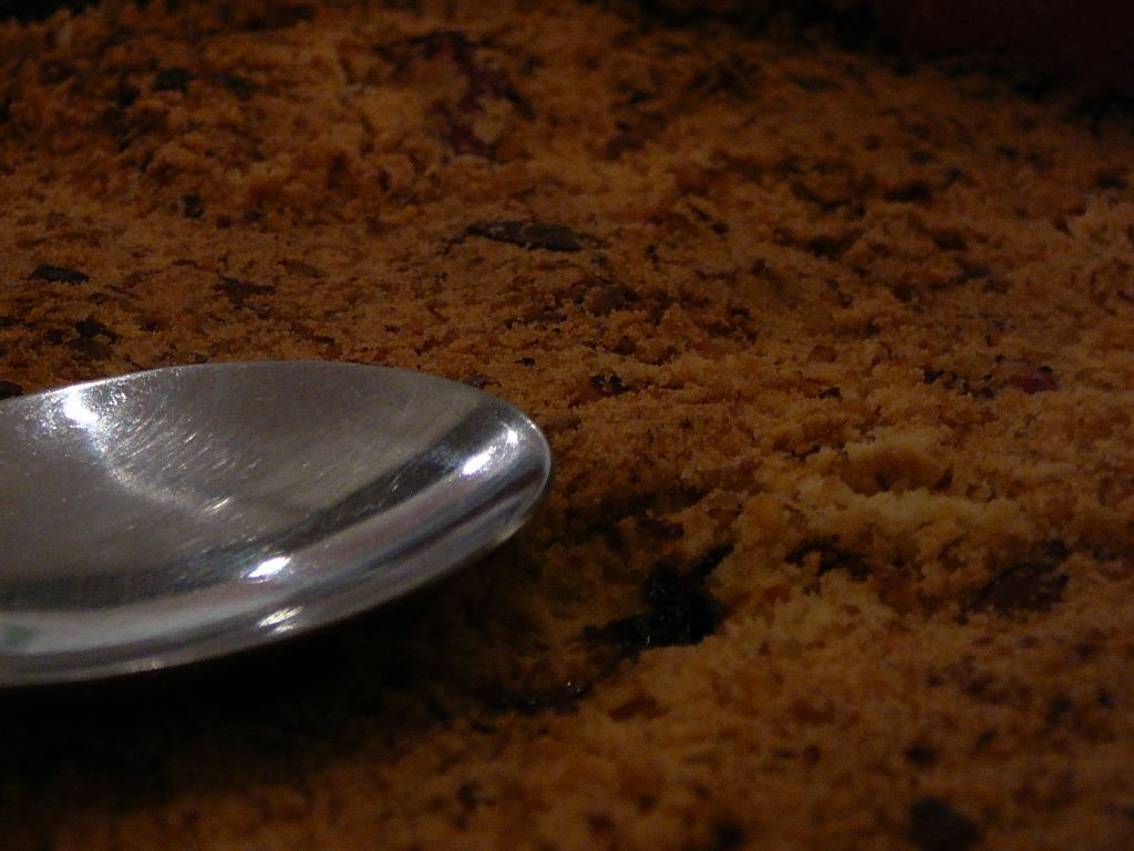 9. Seb termine de préparer son crumble: un arlequin de crumble aux pommes et au cassis.