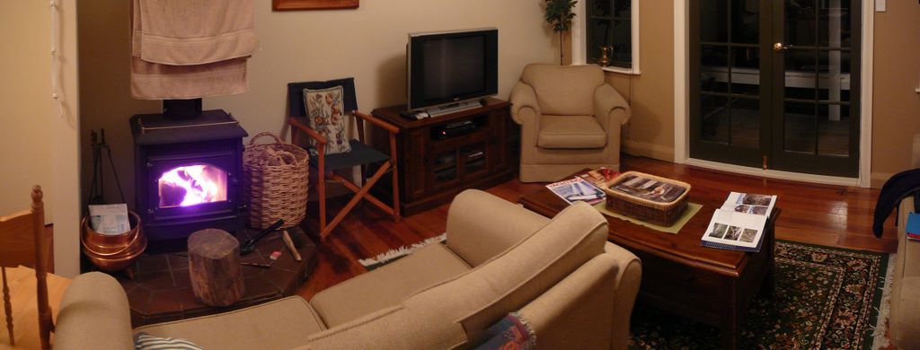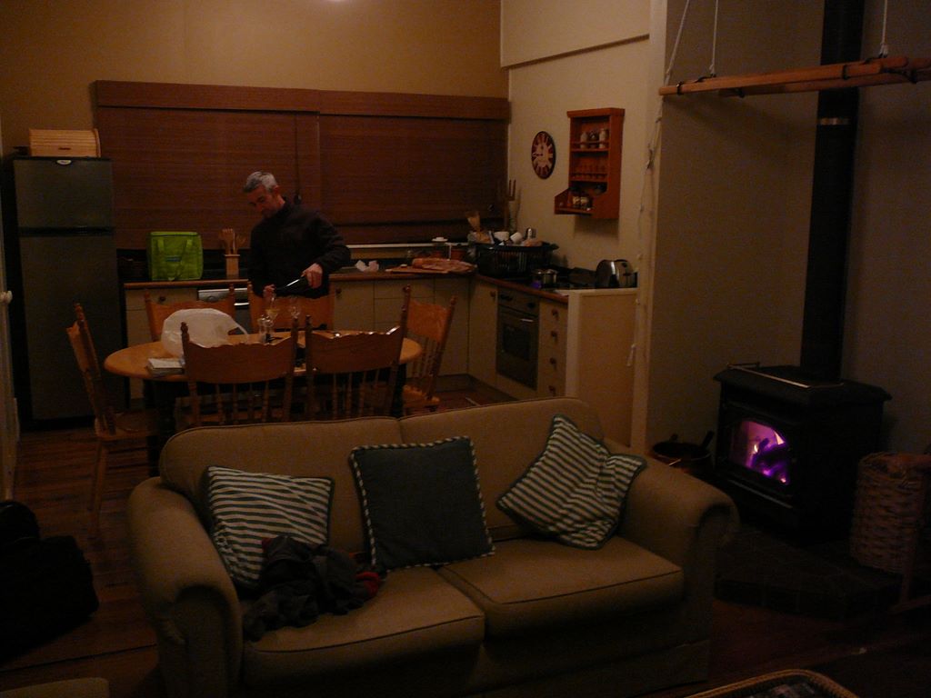 50. L'intérieur du cottage, une fois la nuit tombée, avec un bon feu de cheminée.