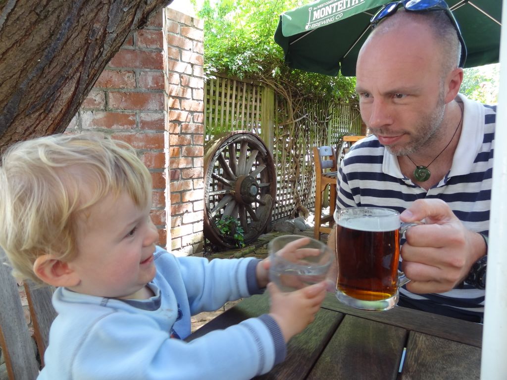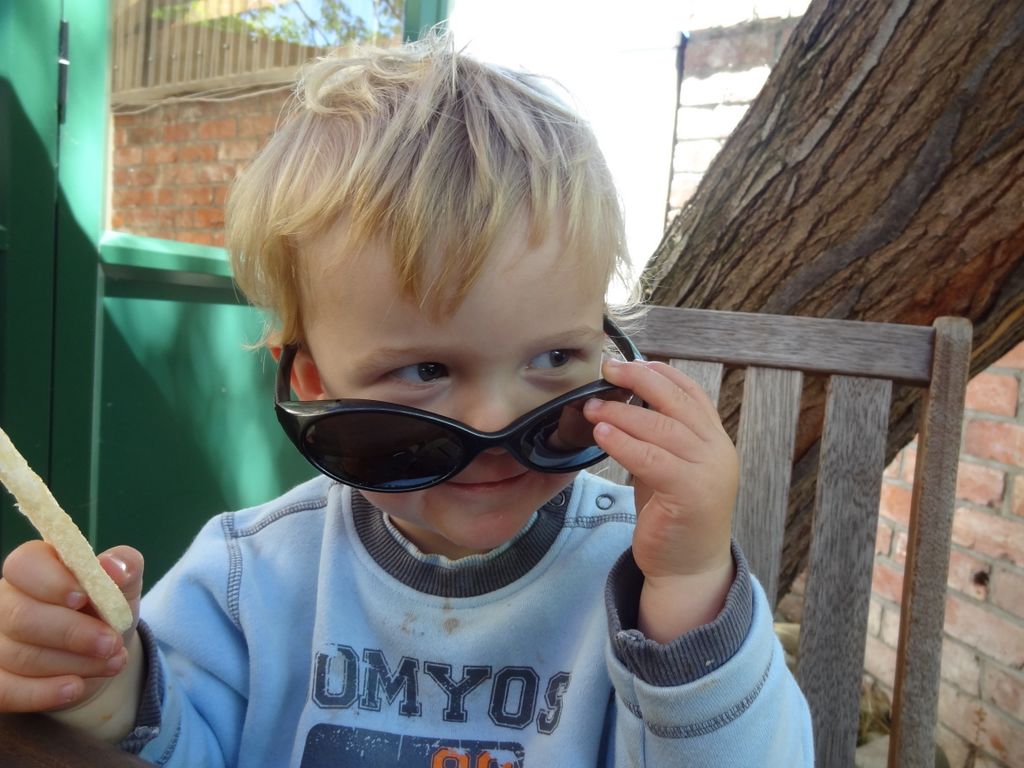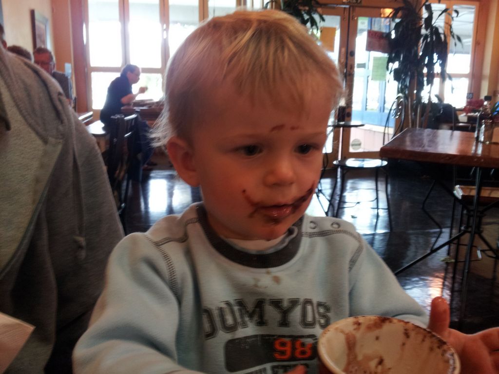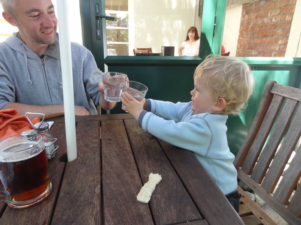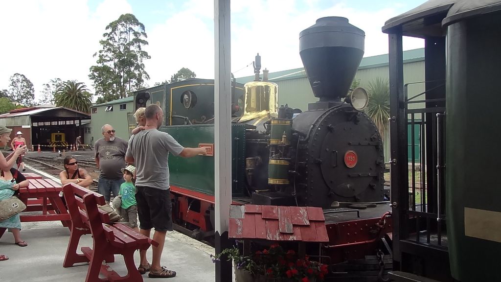 236. Une loco vapeur depoque passe a cote de notre table. Ca impressionne un peu Adan, tout ce bruit et cette fumee.