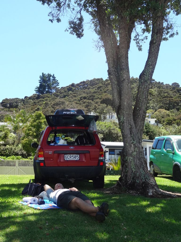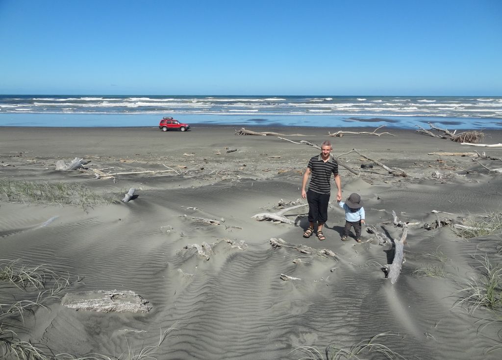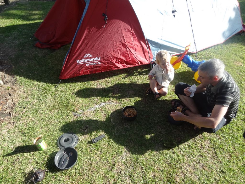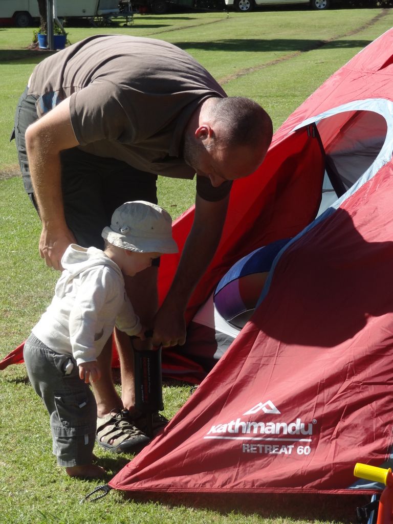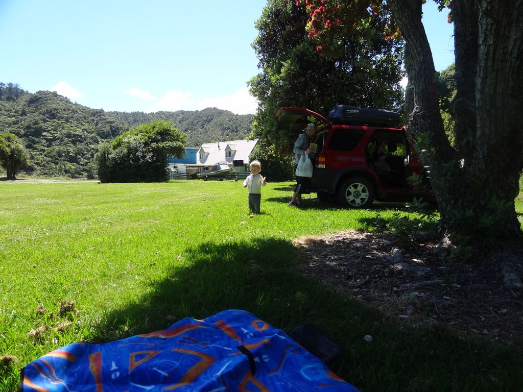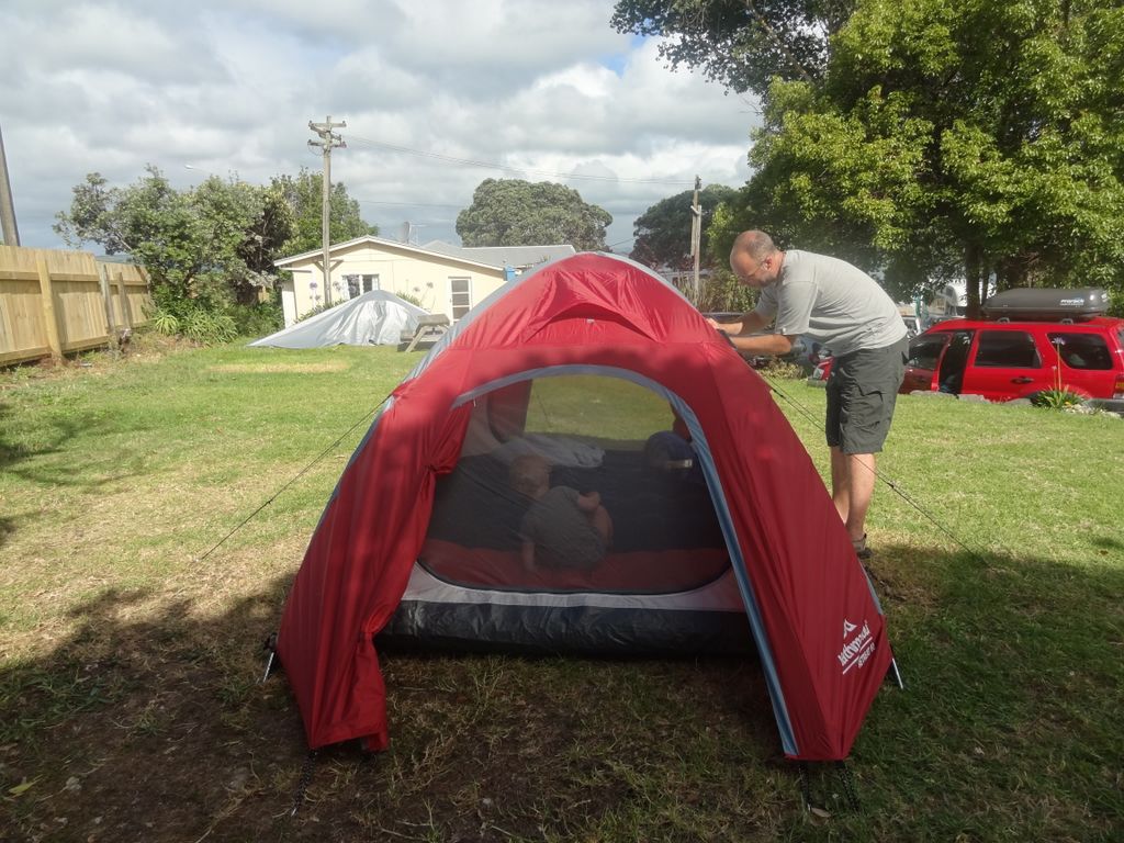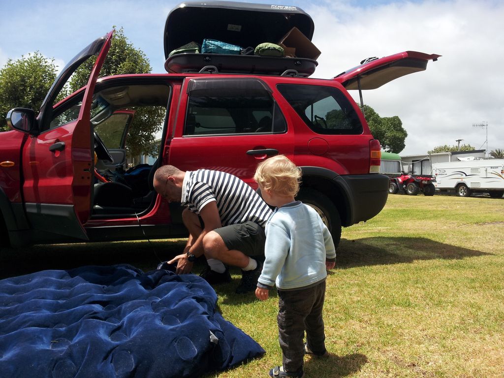 4. Premier arret, premier camping, a Himatangi. Adan est tres intrigue par ce que papa fait.