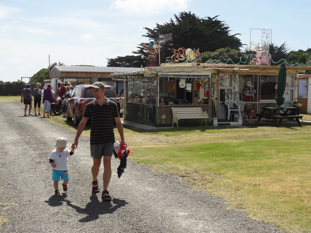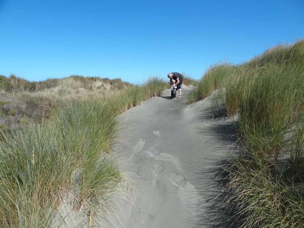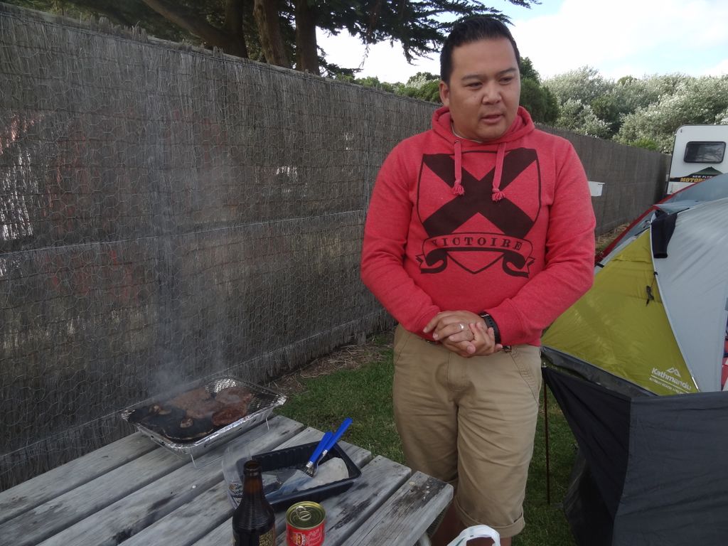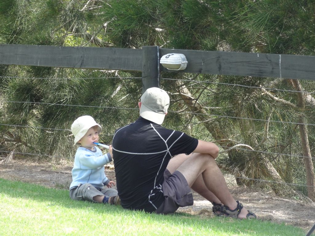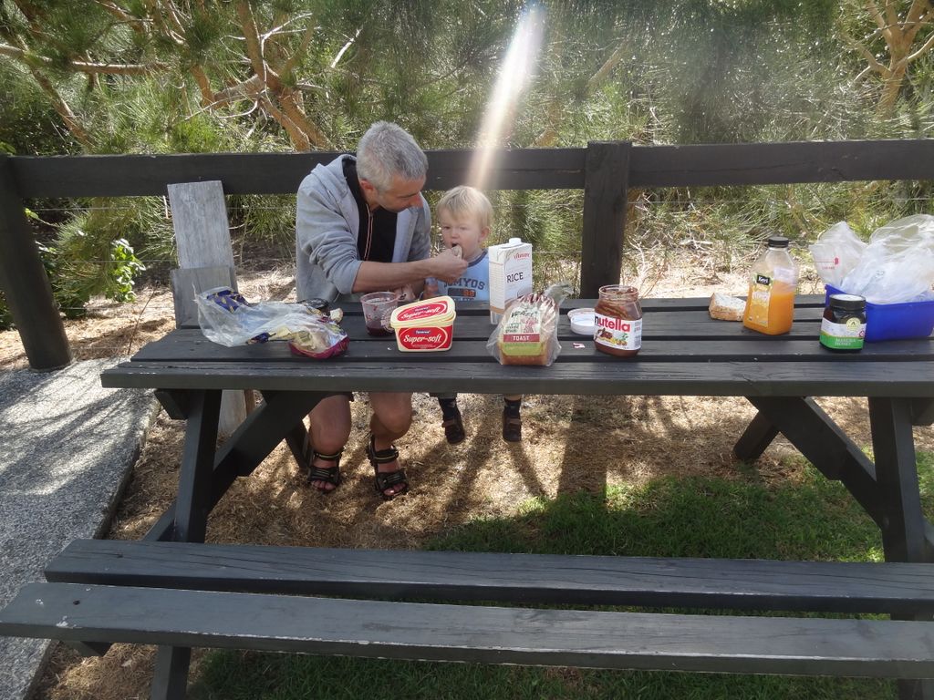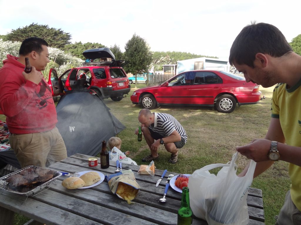 4. Premier arret, premier camping, a Himatangi. Adan est tres intrigue par ce que papa fait.
