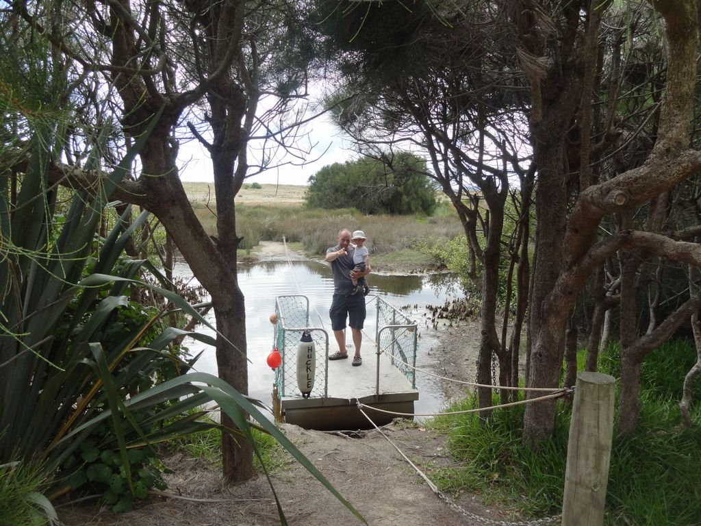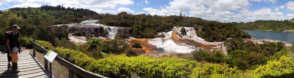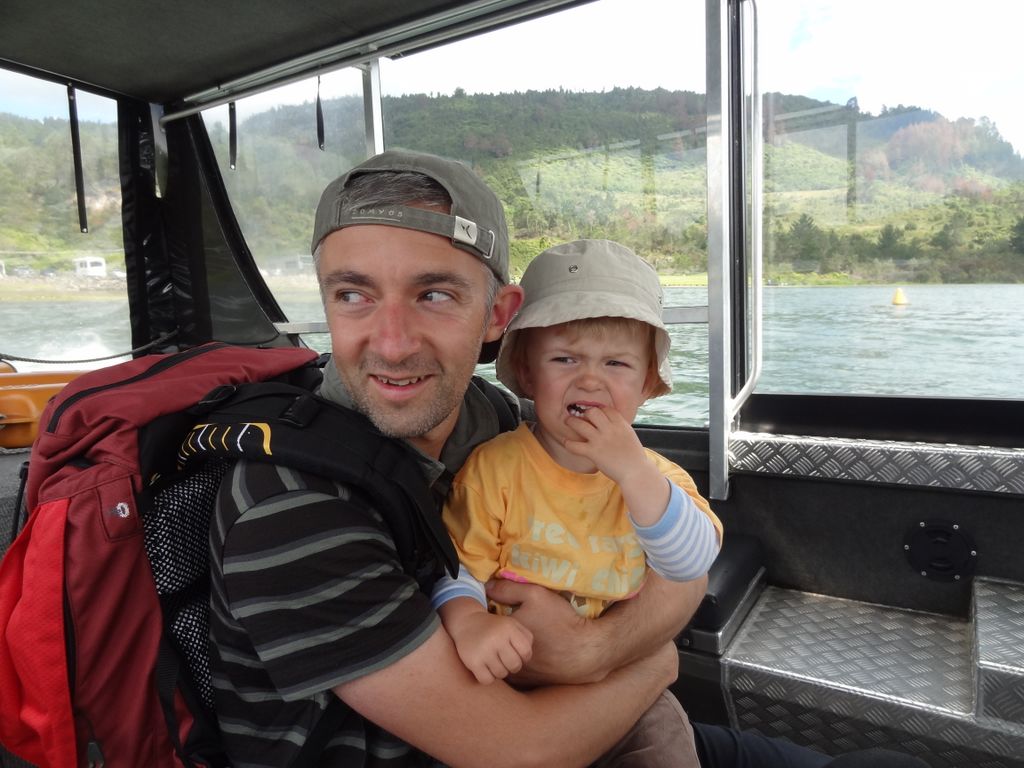 257. Plus tard, on part visiter Orakei Korako, un parc geothermique. Il faut emprunter un bateau pour s'y rendre, et Adan n'aime pas trop le bruit du moteur.