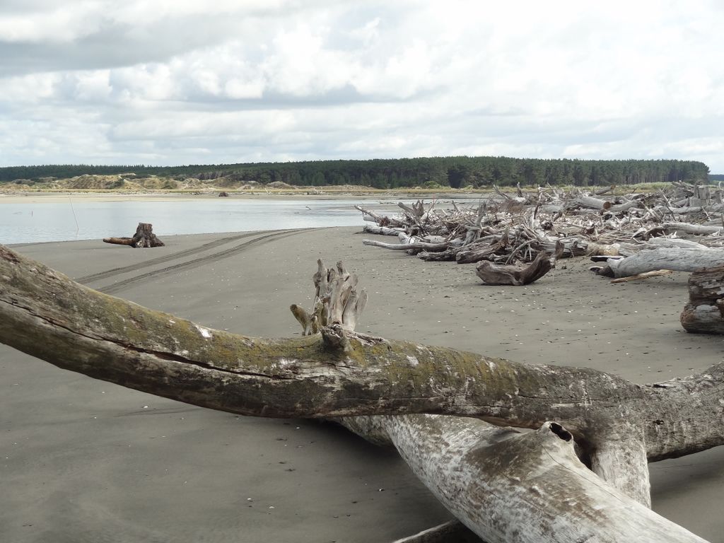 37. Pour rejoindre le reseau routier, on longe un estuaire jonche de bois lave.
