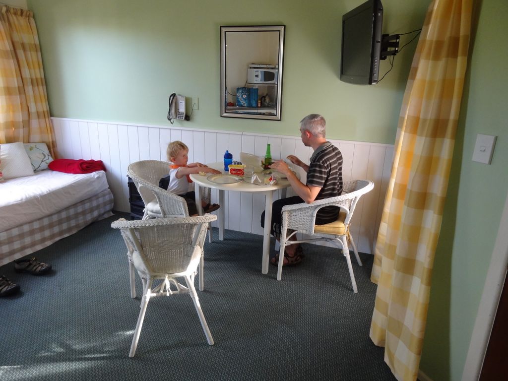 50. Nous sommes dans un backpacker mais plutot bien loges quand meme puisqu'a part. Ici, pas de chaise haute, Adan mange a table avec nous.