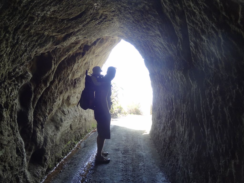80. Un pecheur local nous a rejoint, lance sa ligne et plante sa cane a l'entree du tunnel. Lui, est a l'ombre du seul arbre.
