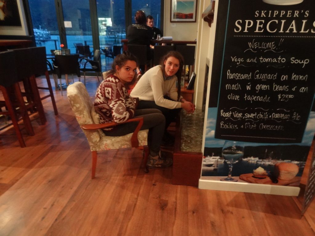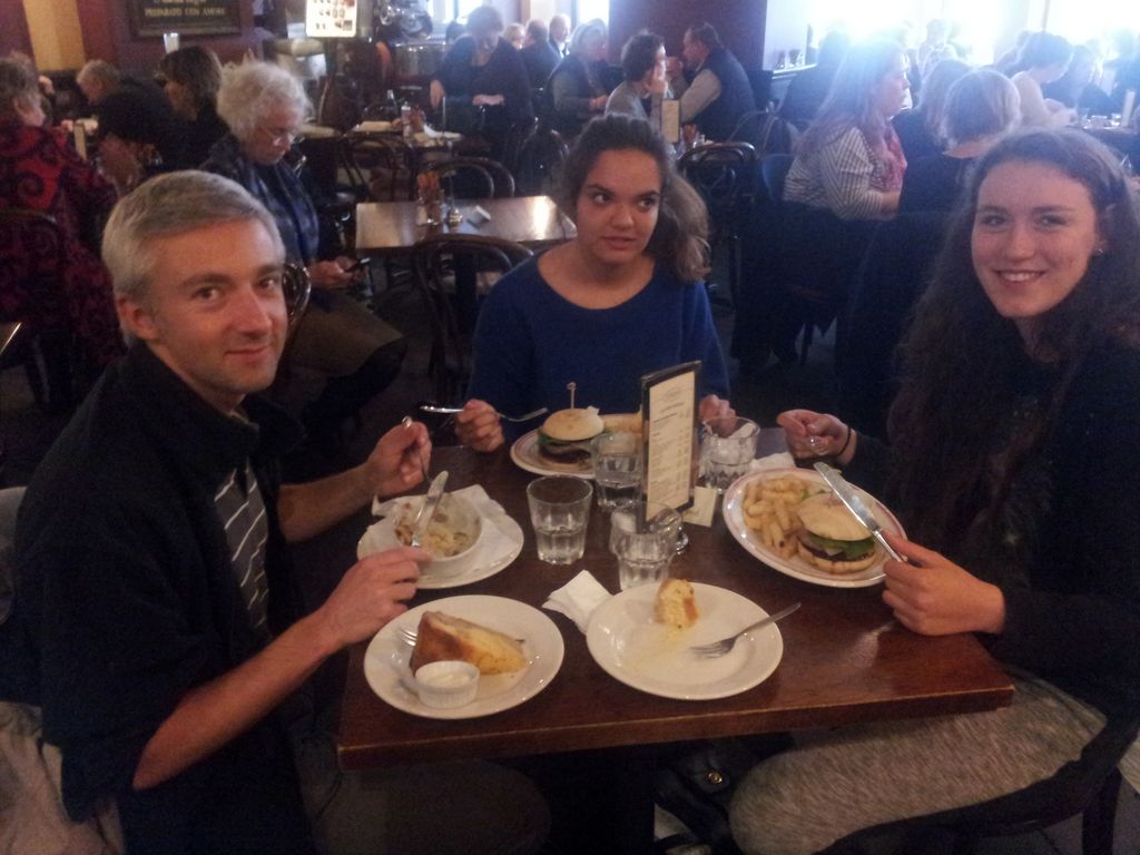 2. Jeudi. Sarah et Marine sont arrivees hier, et on leur fait decouvrir un peu Wellington. Ici, avec un hamburger a l'agneau.