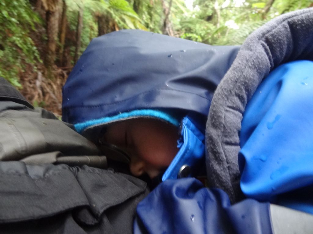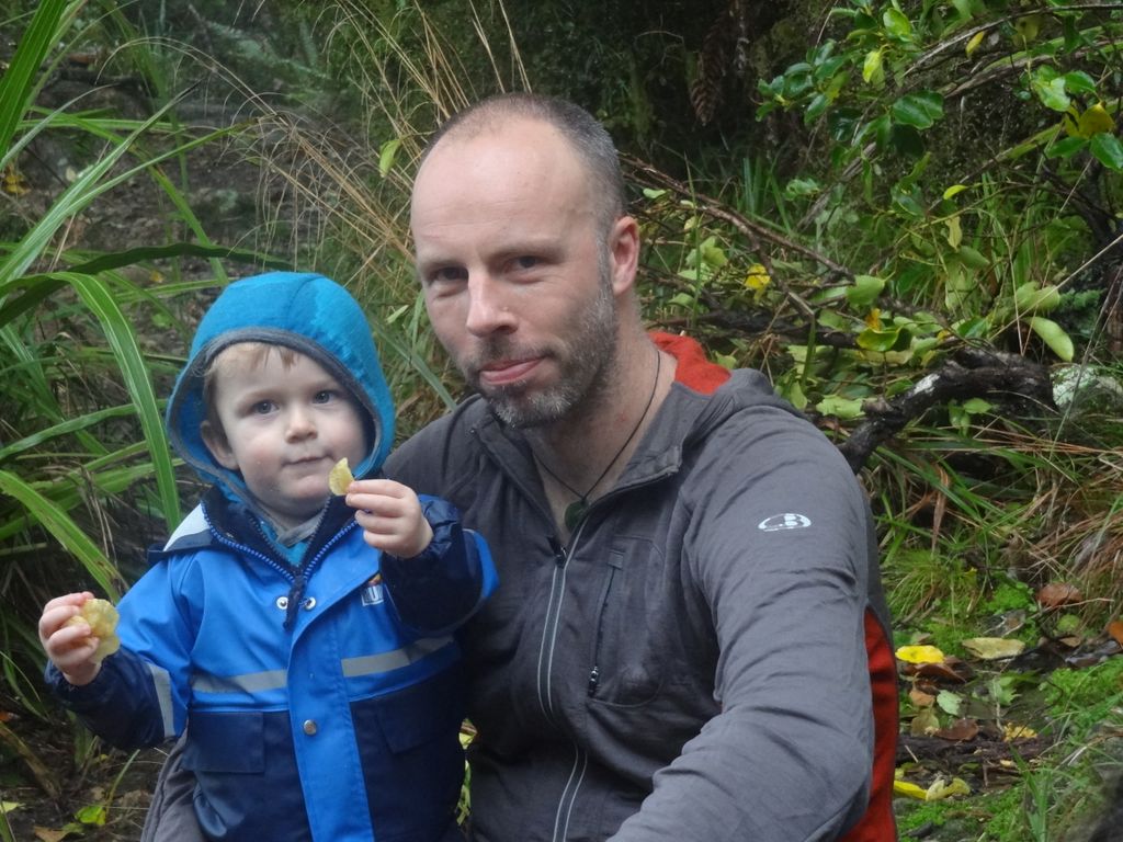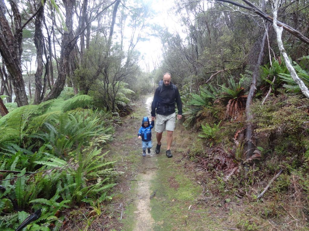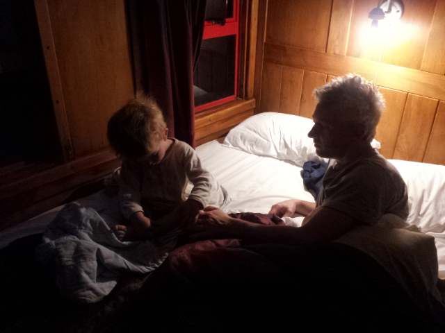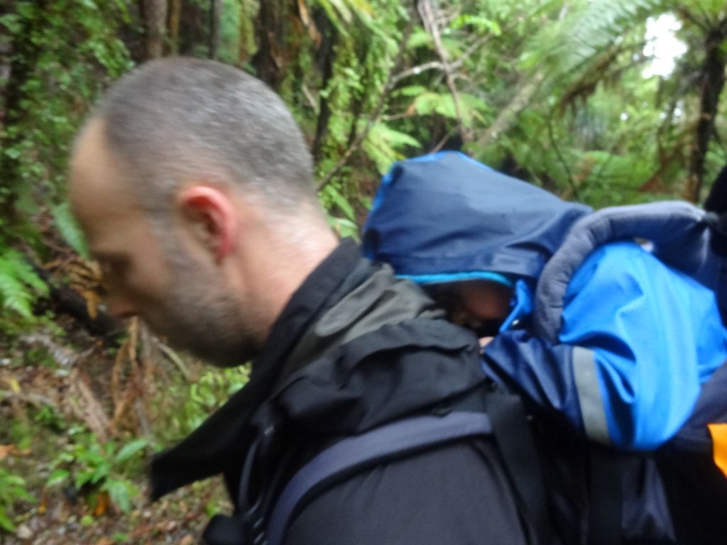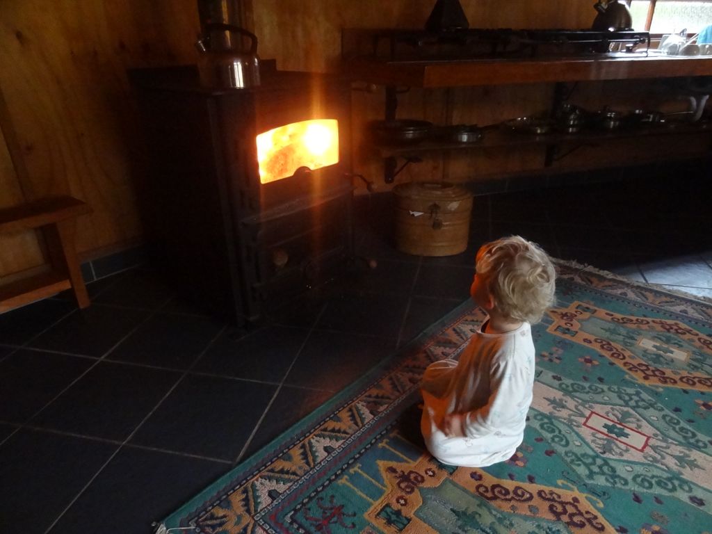 62. Aujourd'hui, nous allons marcher 5h pour rejoindre Duncan Bay et rentrer ensuite a Havelock. Le temps est maussade, Adan profite de la cheminee.
