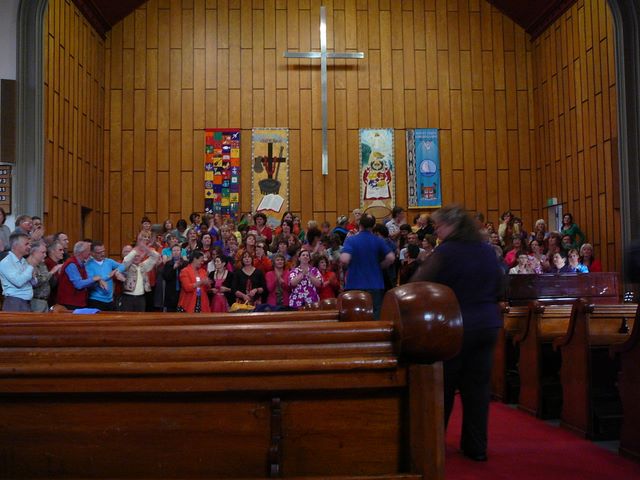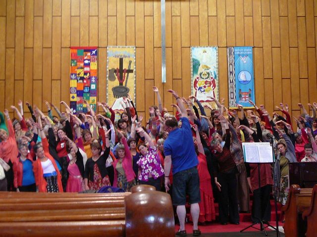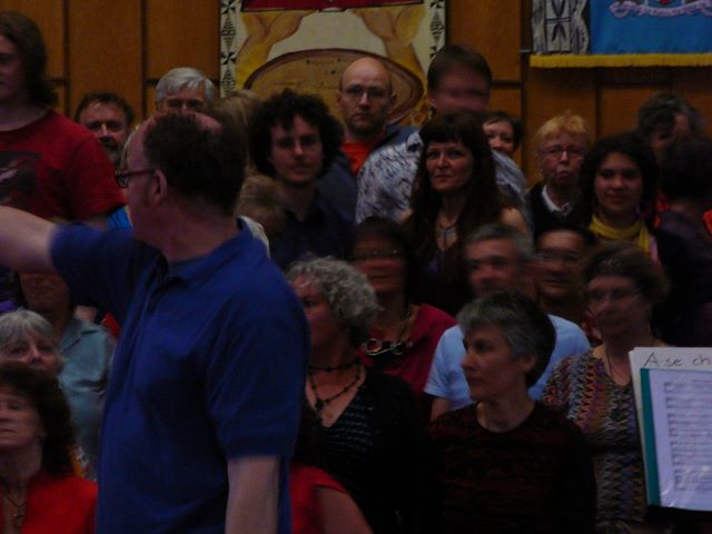 52. Il chante avec sa chorale. C'est le petit gars en bleu, un peu à droite (sur la photo) du chef d'orchestre.