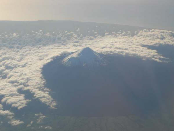 1. 12 octobre. Manu et moi volons vers Wellington. A droite de l'avion, le mont Taranaki