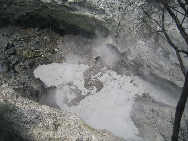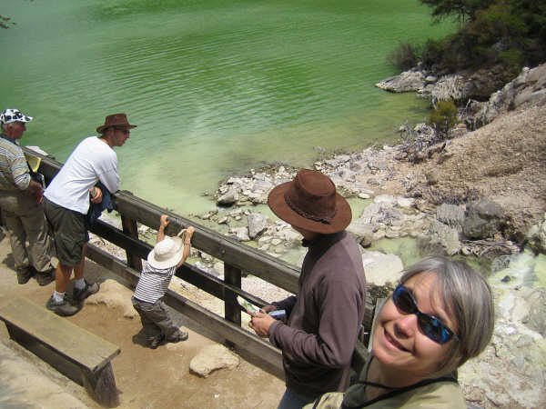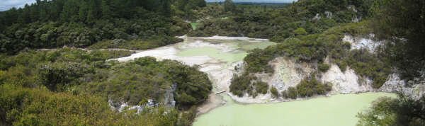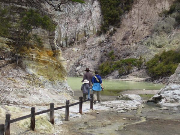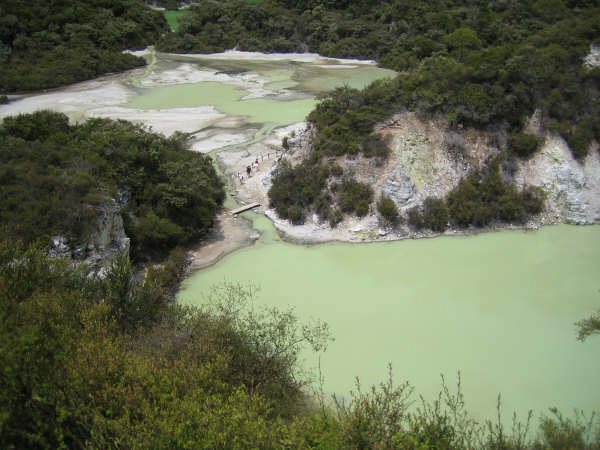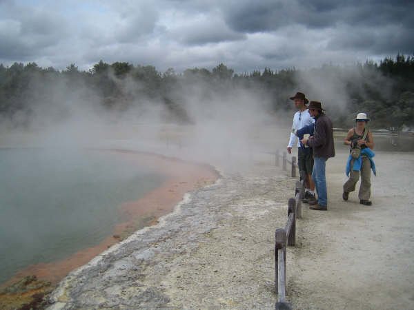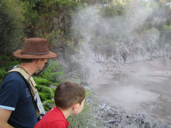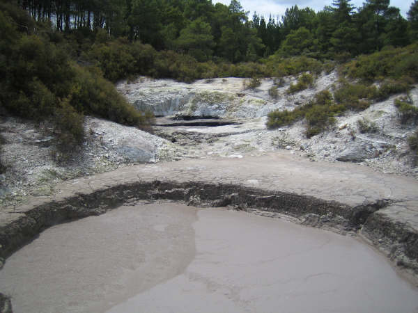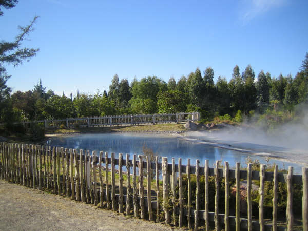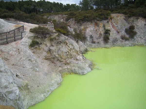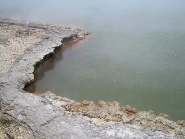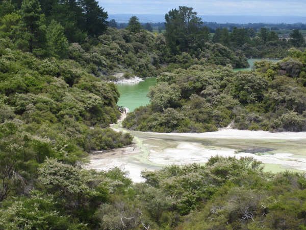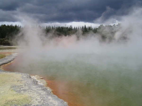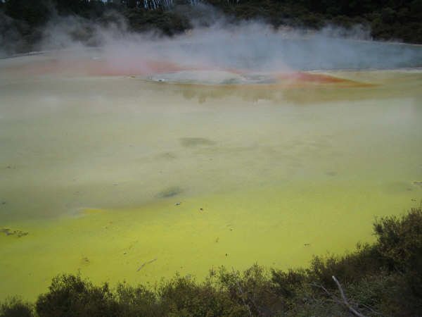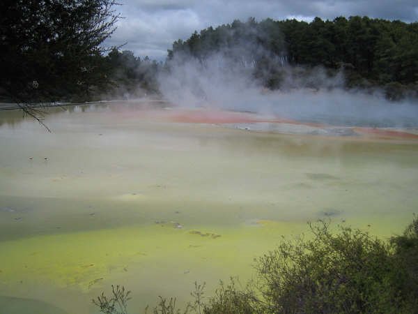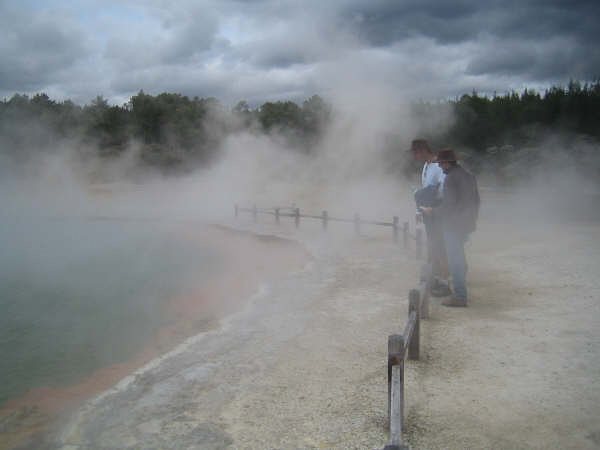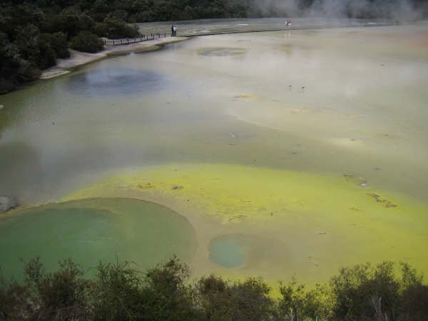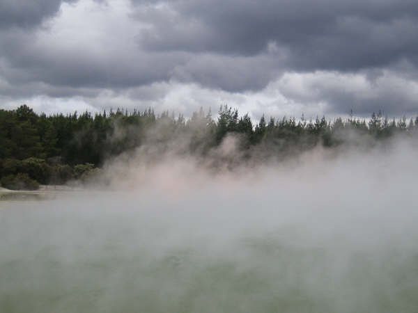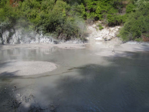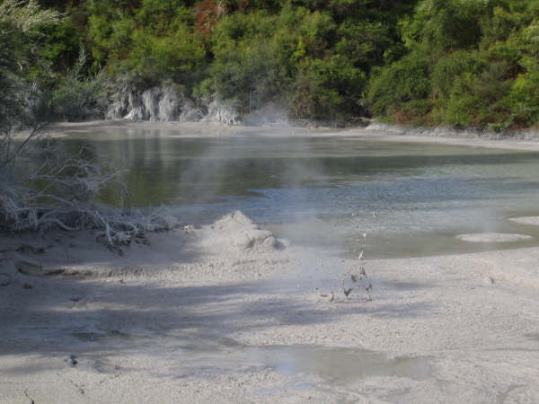 26. Nous roulons vers le Nord, vers Rotorua et croisons les premières bizarreries volcaniques. Ici, un bassin qui fume