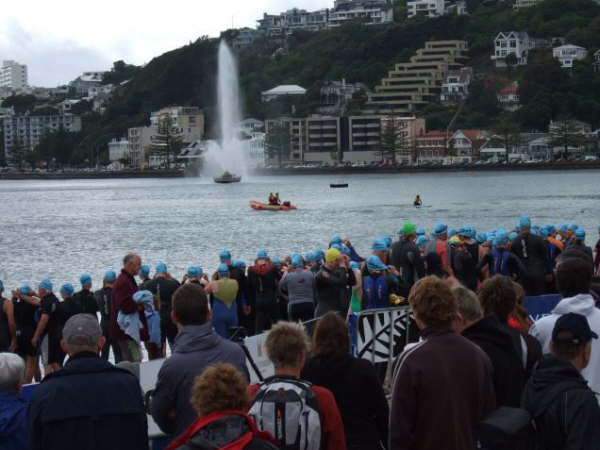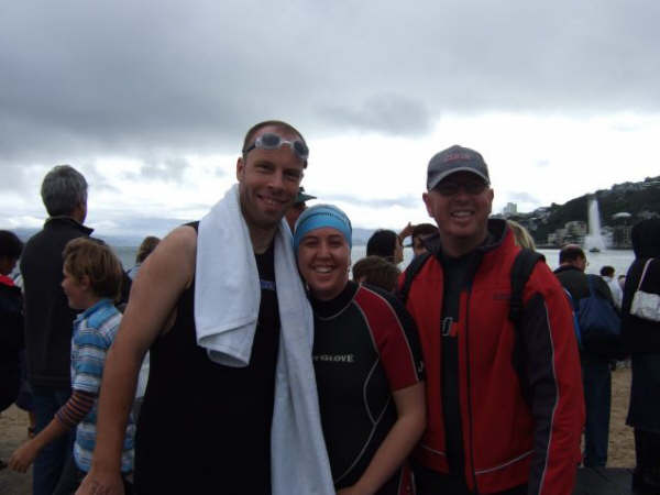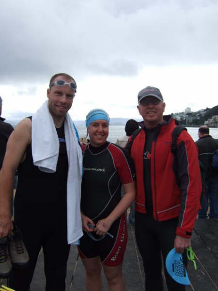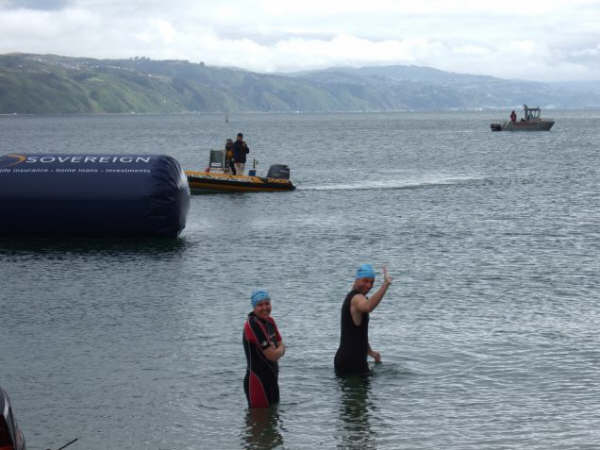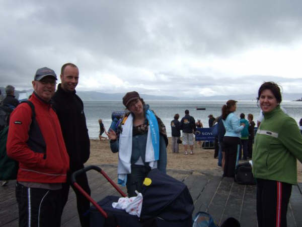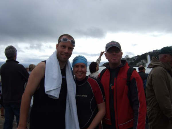 1. Et ouais!!! Me voila samedi matin, avec Lisa (a droite sur la photo) a attendre le depart d'une course a la nage ...