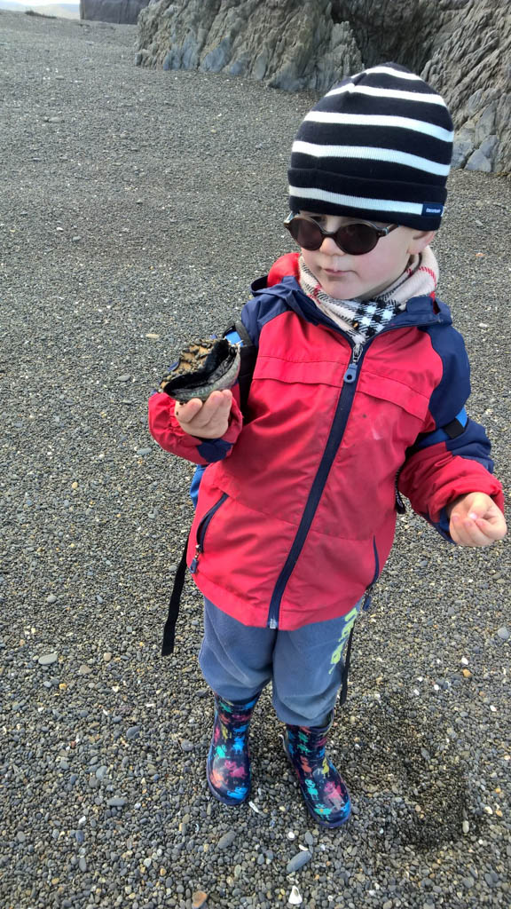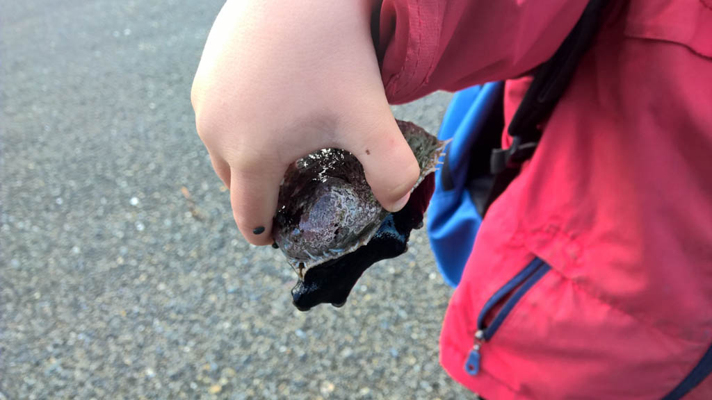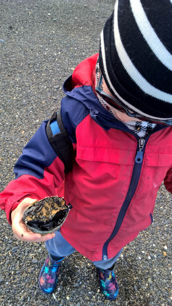 7. Adan a trouvé un paua ("ormeau" en français) et le montre.