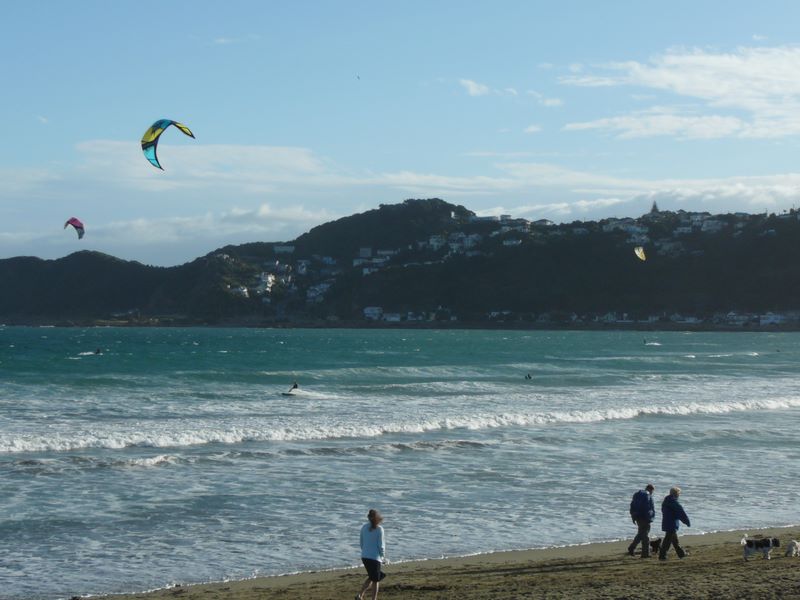 4. Vendredi 5 mars. Entre autres visites de maisons, nous profitons encore de Wellington. Ici, en attendant des amis, c'est le ballet des "kite surfs" ....