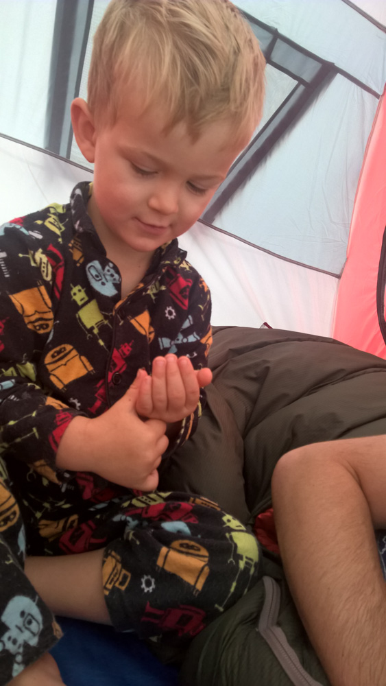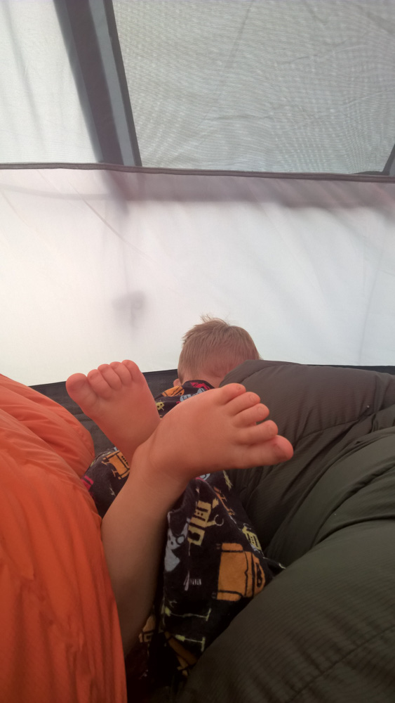 4. Samedi matin. Des petits pieds se balancent dans la tente pendant que leur propriétaire ...
