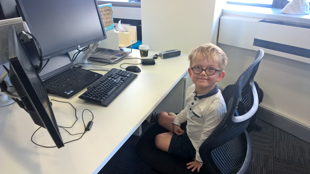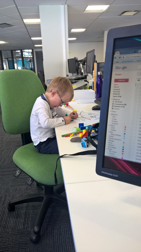 1. Aujourd'hui, Adan vient passer la matinée au travail de Gros Papa. Il a préparé son sac et est TRES content!