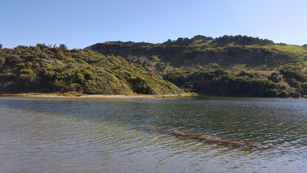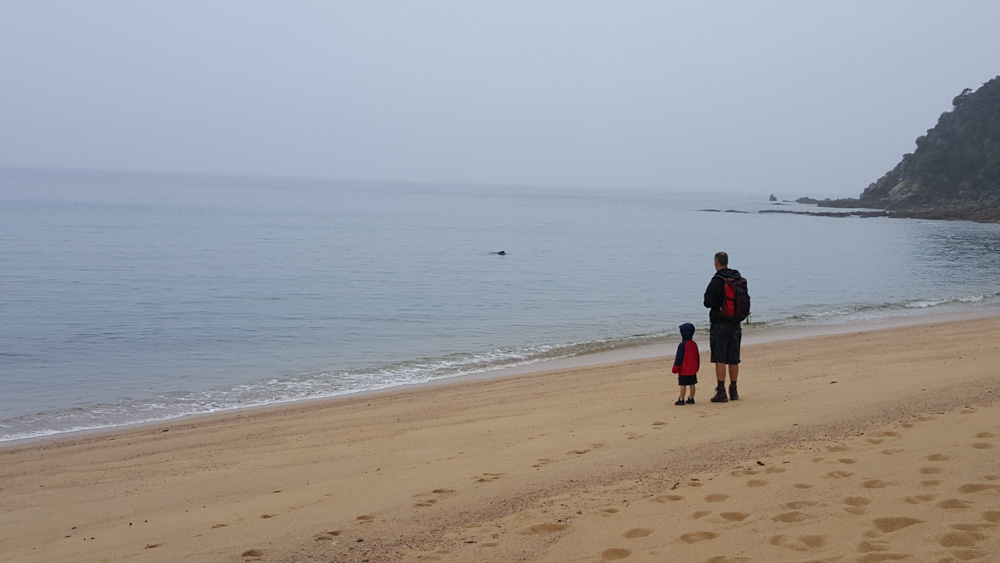 65. Anapi Bay. Adan marche, sans rechigner. Dans l'eau, un phoque.