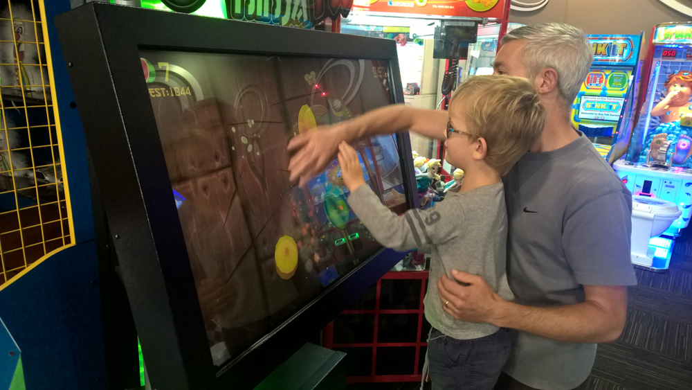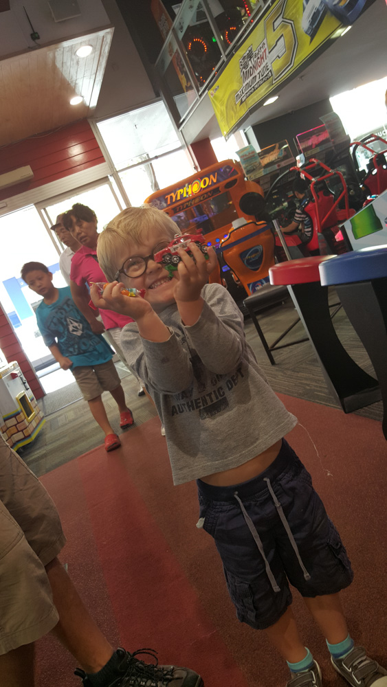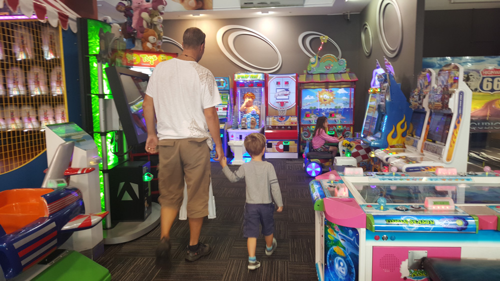 4. Samedi. On se promène en ville. Ici, dans une salle de jeux, une première pour Adan.