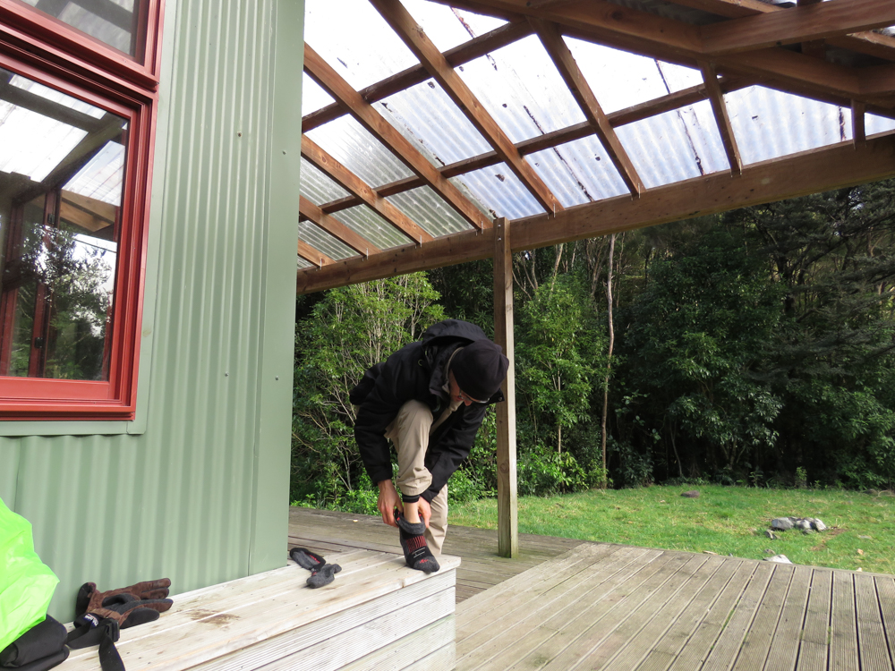 65. Inmanquablement, il y a les chaussettes mouillées de la veille à renfiler. Pas le meilleur moment!