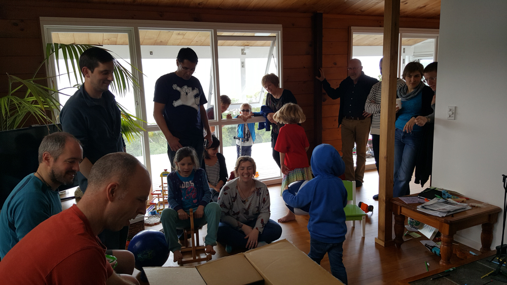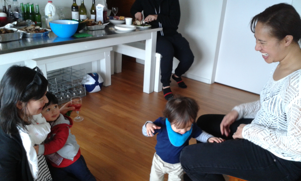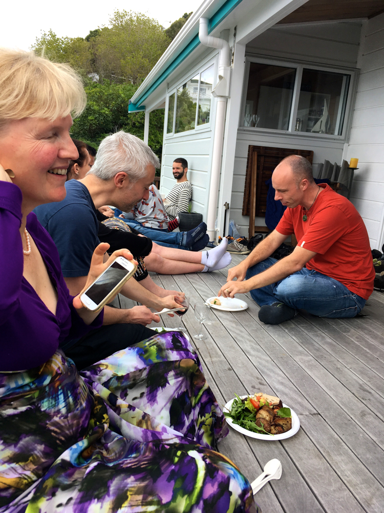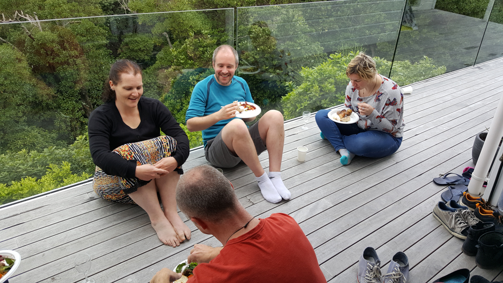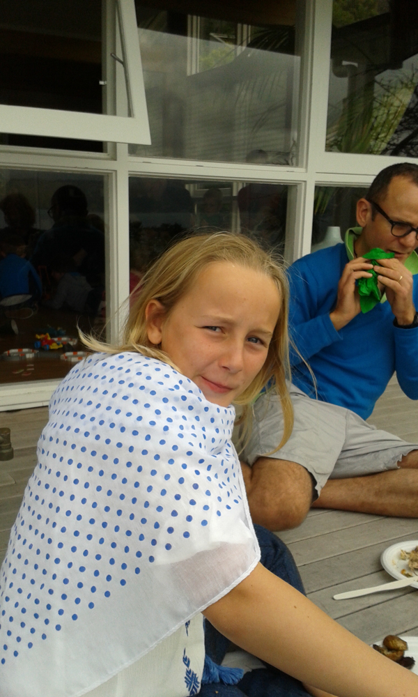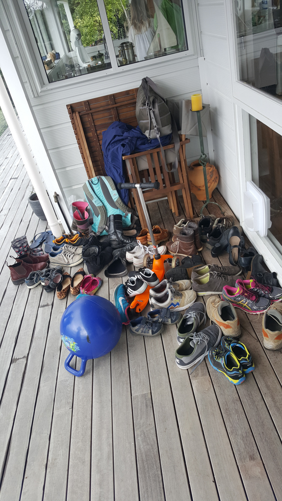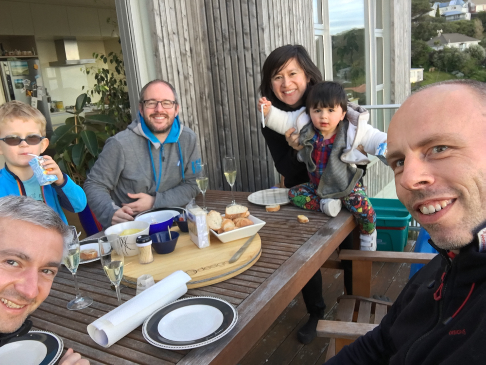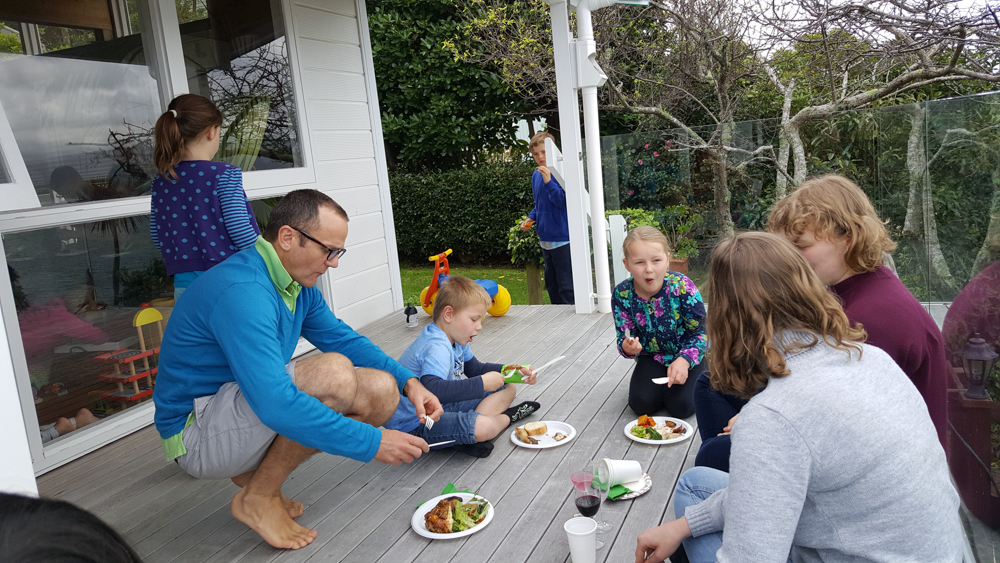 17. On n'a pas encore de grande table pour dehors (et les terrasses en bas sont en travaux), donc c'est à la bonne franquette, et ça convient à tout le monde.