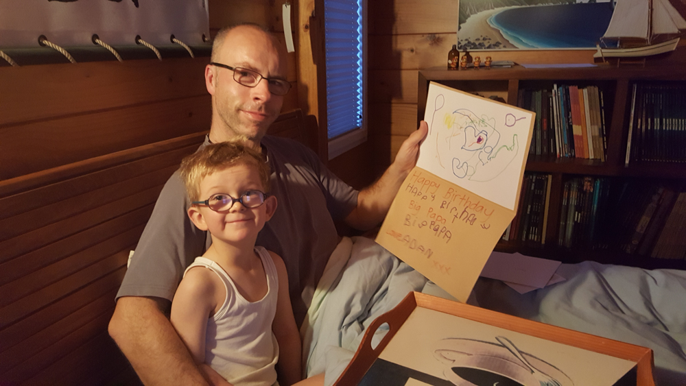 31. Puis vient le jour proprement dit. Au réveil, j'ouvre les cartes postales, les cadeaux. Ici, une carte que mon grand garçon Adan m'a écrite, en suivant le modèle que Chelsea lui a fait.