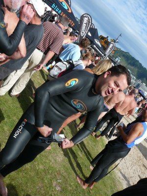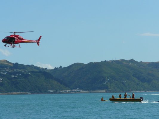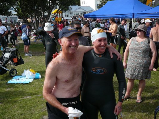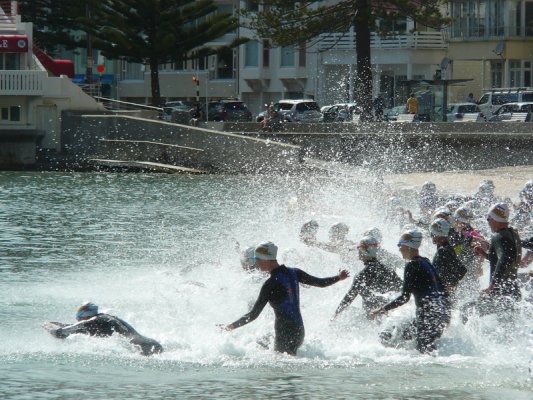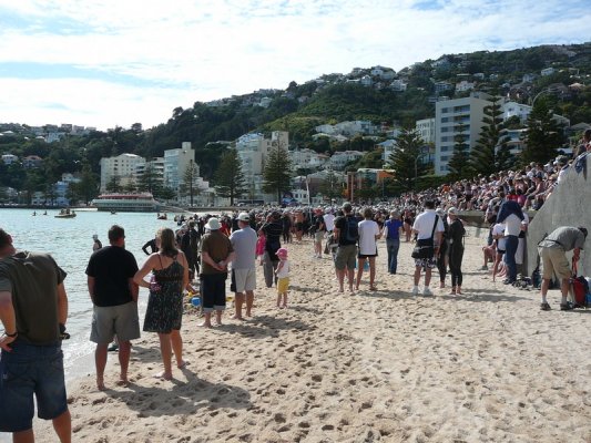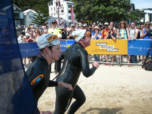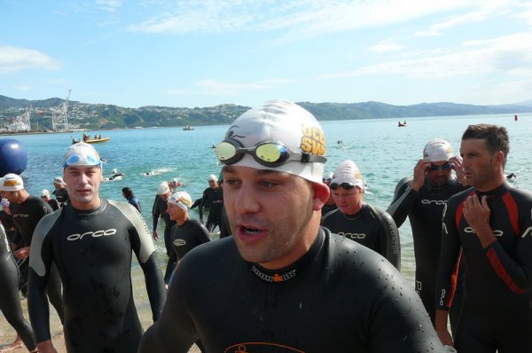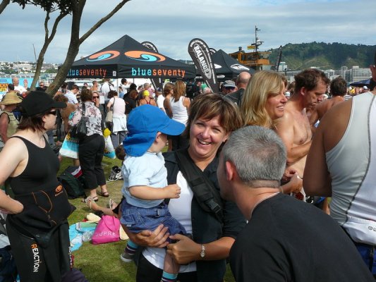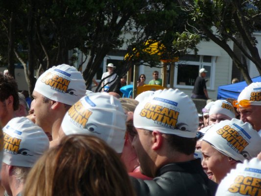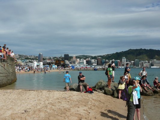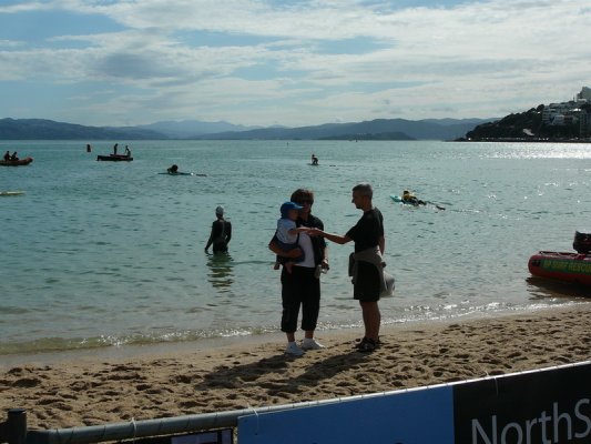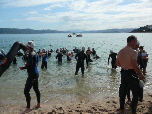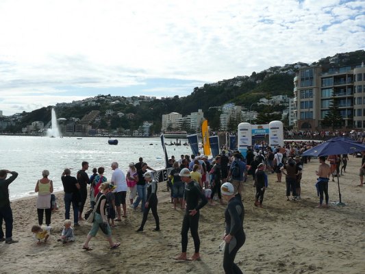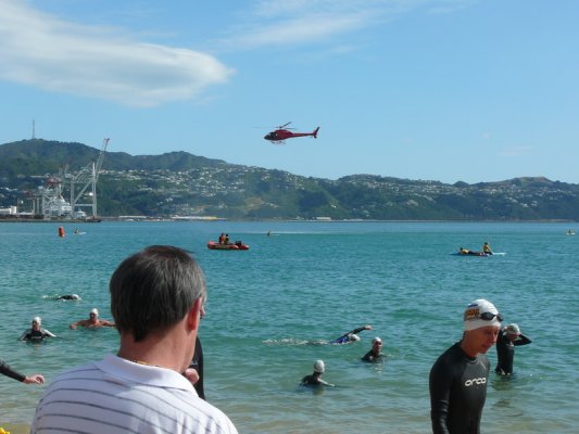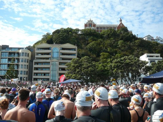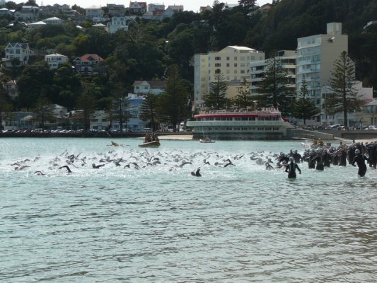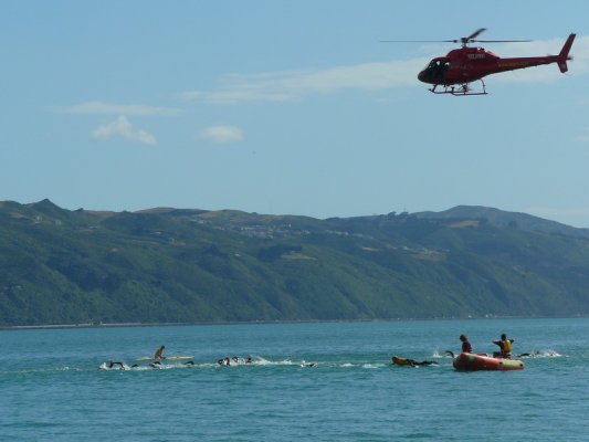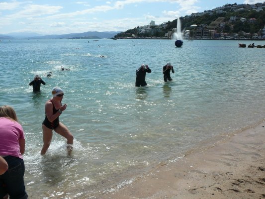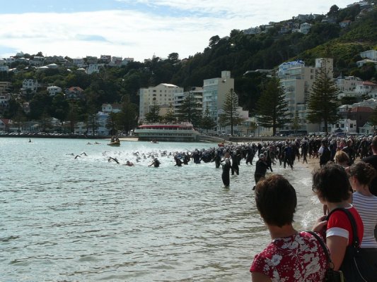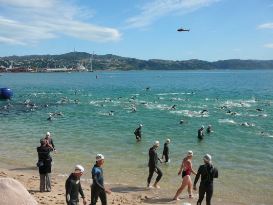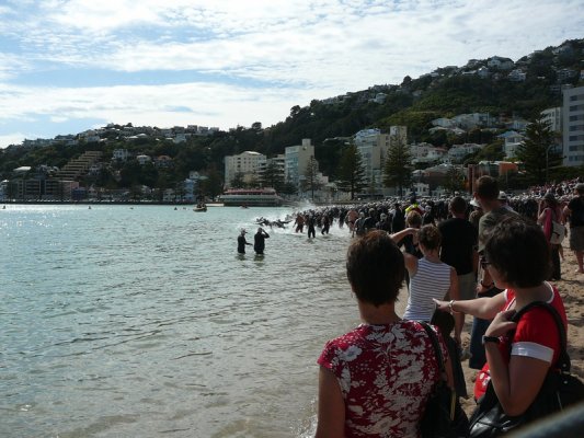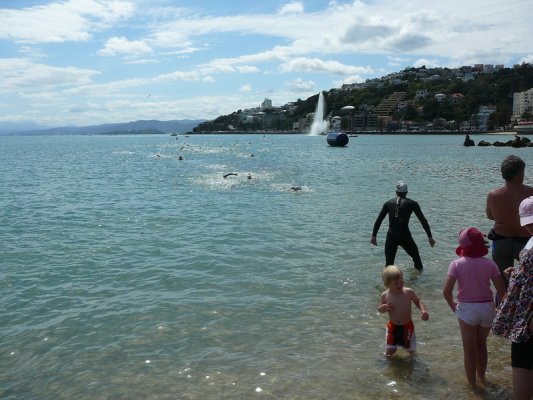 1. Samedi matin. Pour la deuxieme annee, c'est la course a la nage, en mer, dans la baie de Wellington