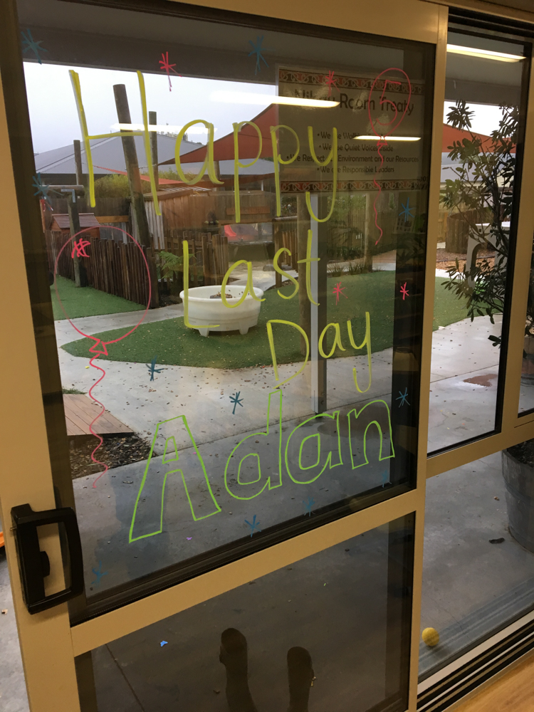 Ce jour devait arriver et il est arrivé: aujourd'hui était le dernier jour d'Adan à Little Wonders avant les vacances, et avant son premier jour à l'école. Le petit gars était heureux, serein, confiant. Ses Papas avaient quand même le coeur gros, rempli de fierté et de tristesse de voir cette page se tourner. Un énorme merci à Chelsea, Kelly, Michelle pour avoir tant donné à Adan et aidé à le préparer pour le grand saut à l'école. Nous savons aussi que Adan leur a beaucoup apporté, à elles mais aussi aux autres enfants: Emily-May, Harvey, Jed, Emily, Isaac, Cooper, Hunter.