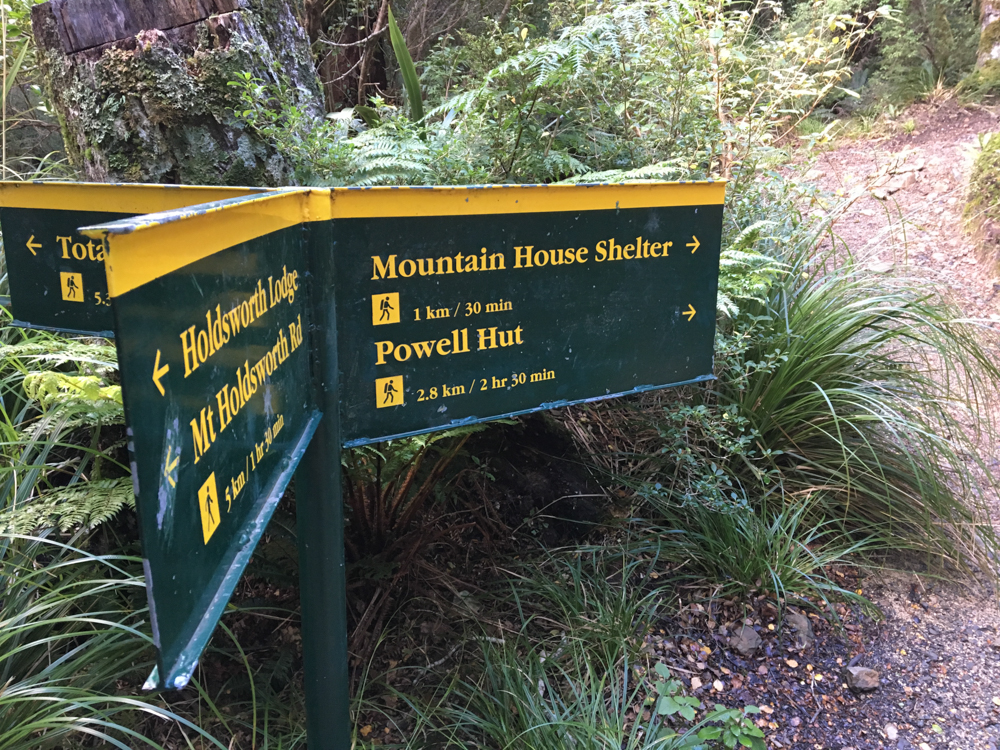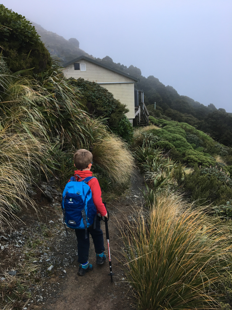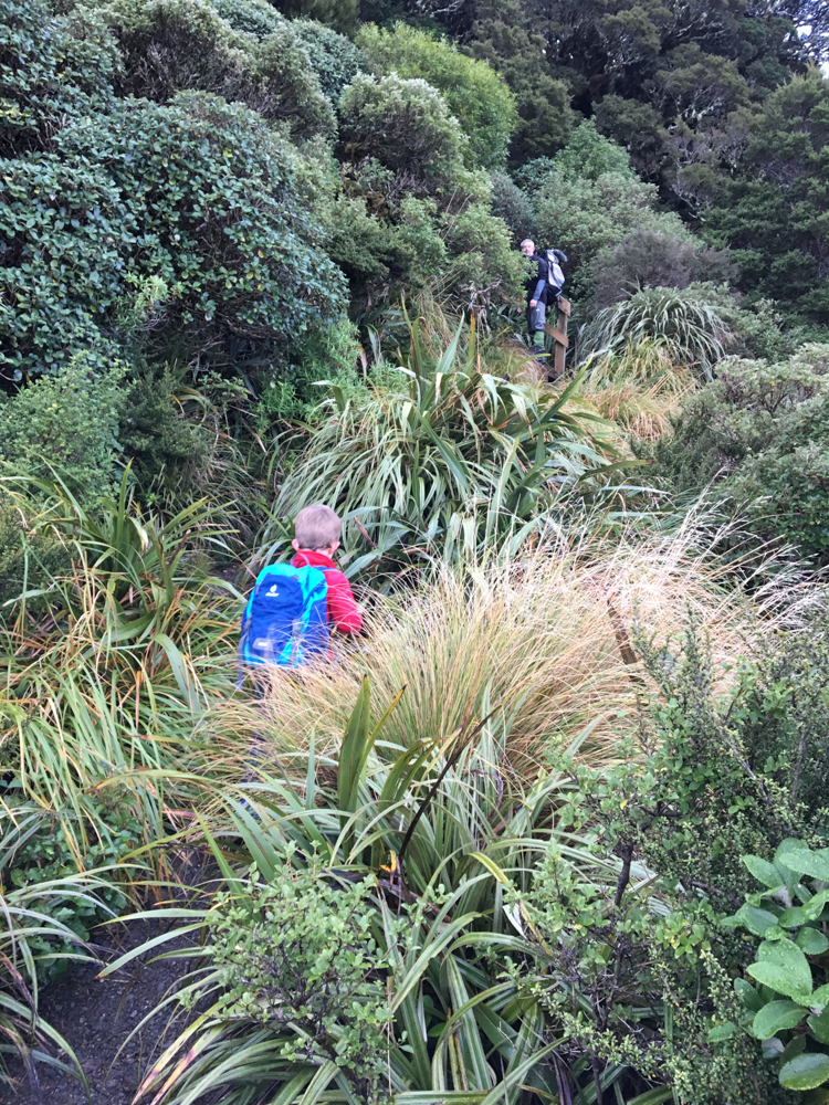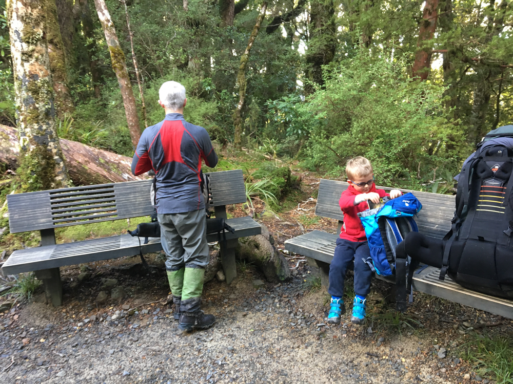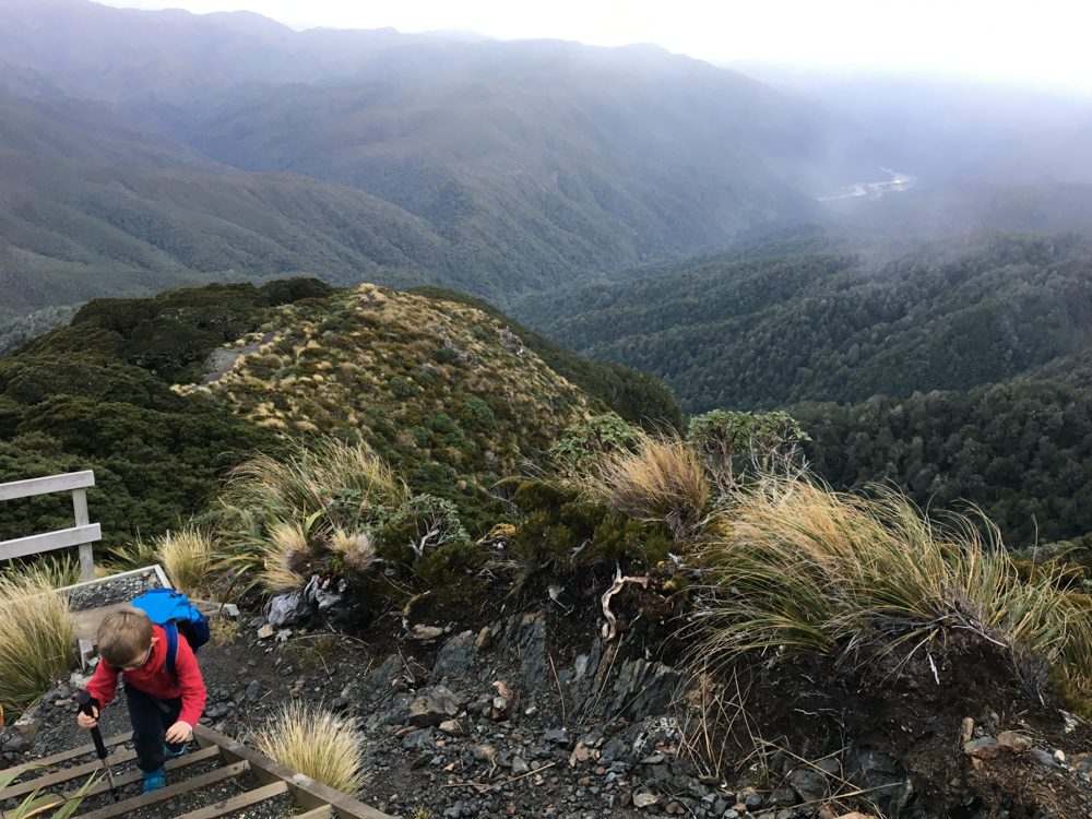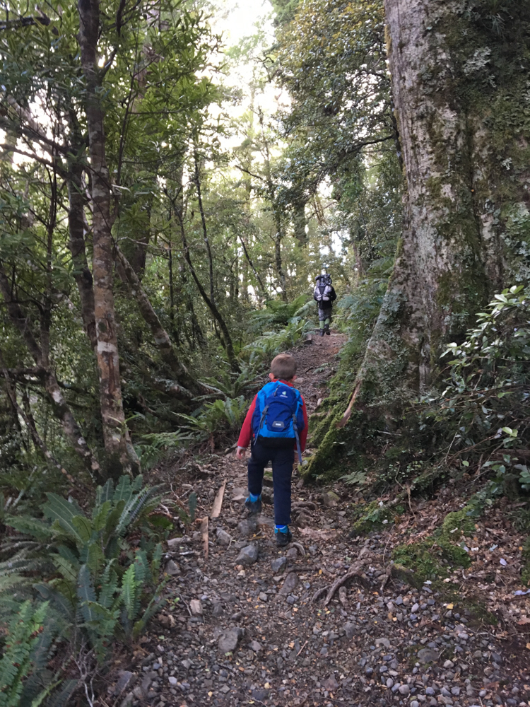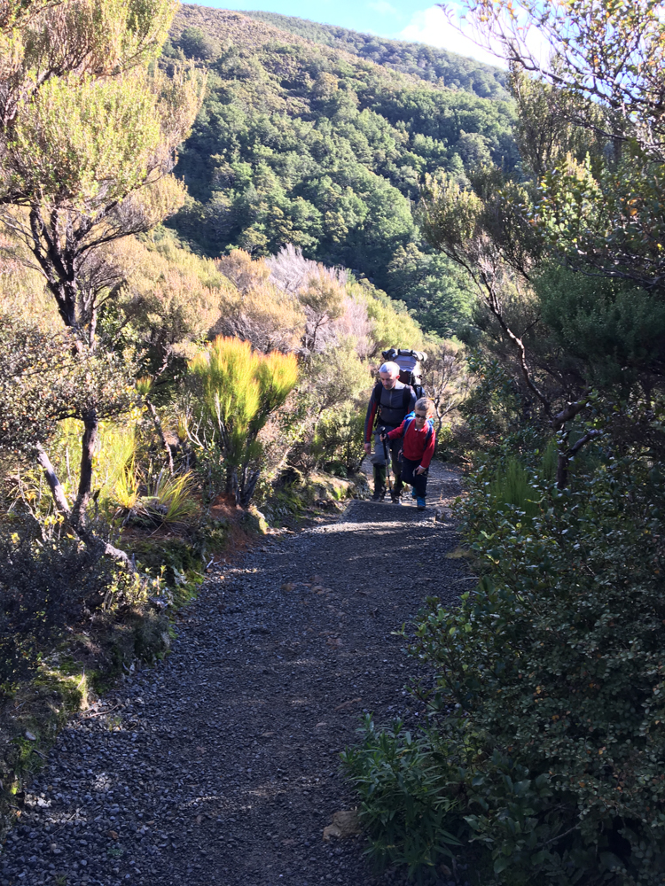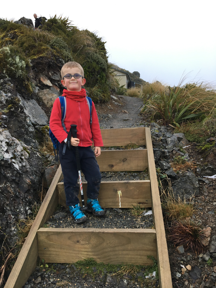 Puisqu'Adan avait pu gravir sans faillir la Kapiti Island (500 mètres de dénivelé positif), il nous était venu l'idée que peut-être, il pourrait se mesurer à l'ascension du Mont Holdworth, en haut duquel (enfin presque du moins) se trouve la Powell Hut. Pour se rendre à ce refuge très connu, 4 heures de marche sont nécessaires, le long d'un chemin bien balisé, et qui grimpe, quand même, de 900 mètres en tout. Gros Papa espérait un peu de neige, et de neige il n'y avait point. Par contre, l'admiration sans borne qu'il avait pour Adan a encore été décuplée! Cet album a été réalisé sans trucage, et aucun enfant n'a été maltraité lors du tournage (sans rire)!