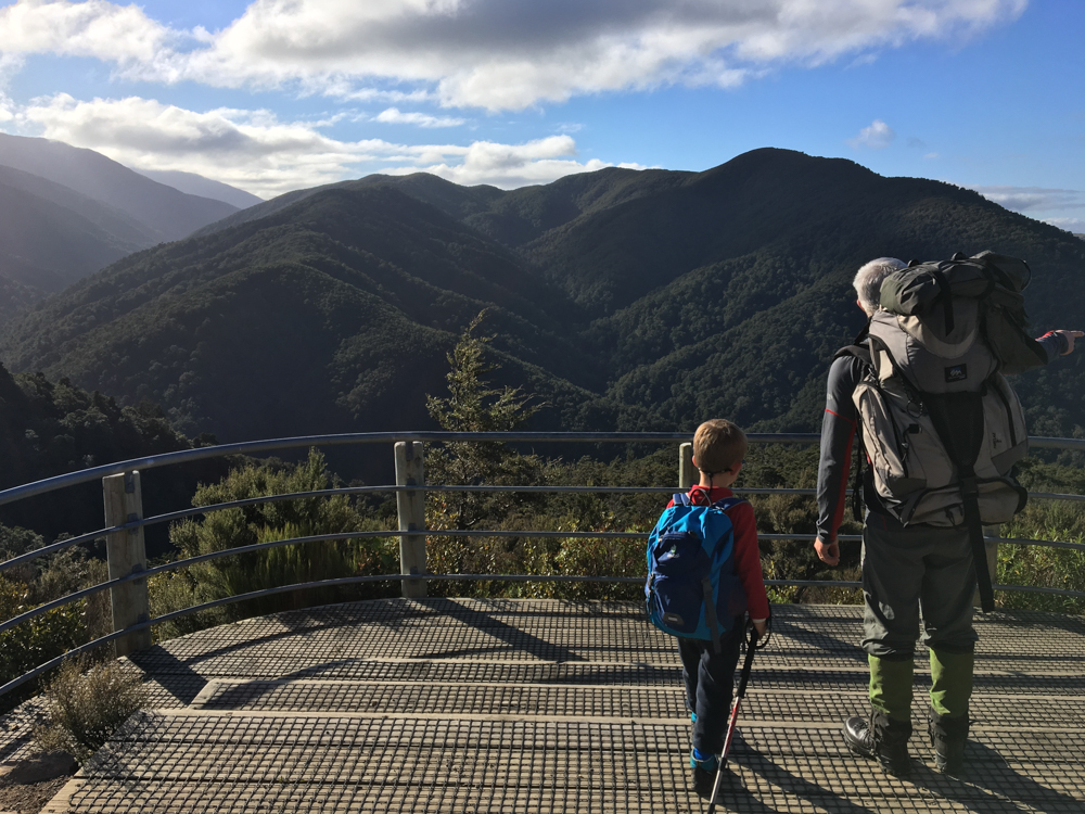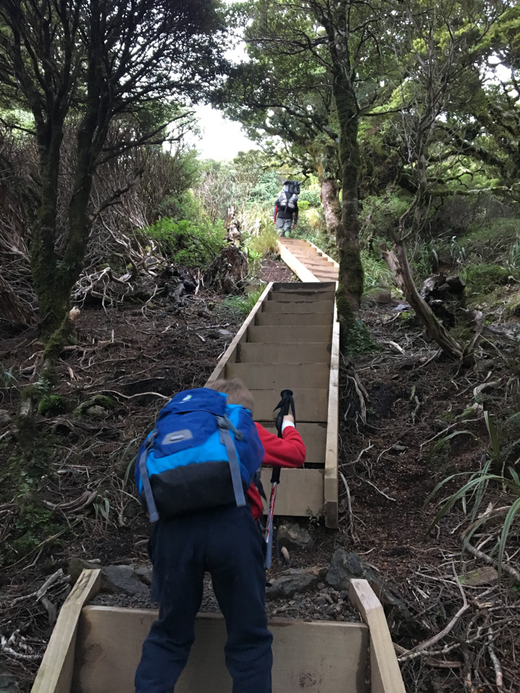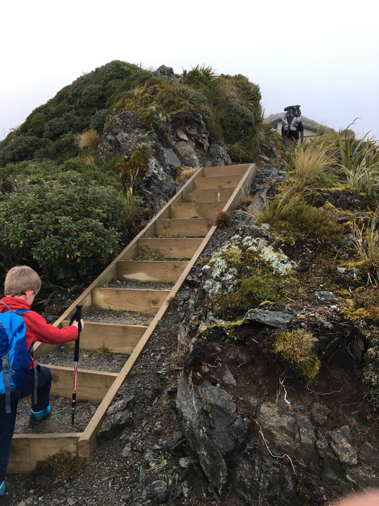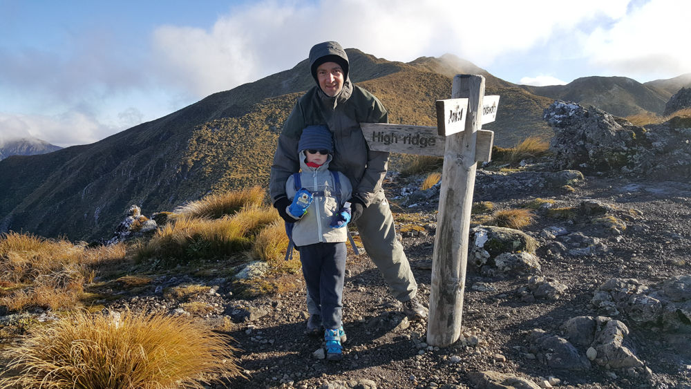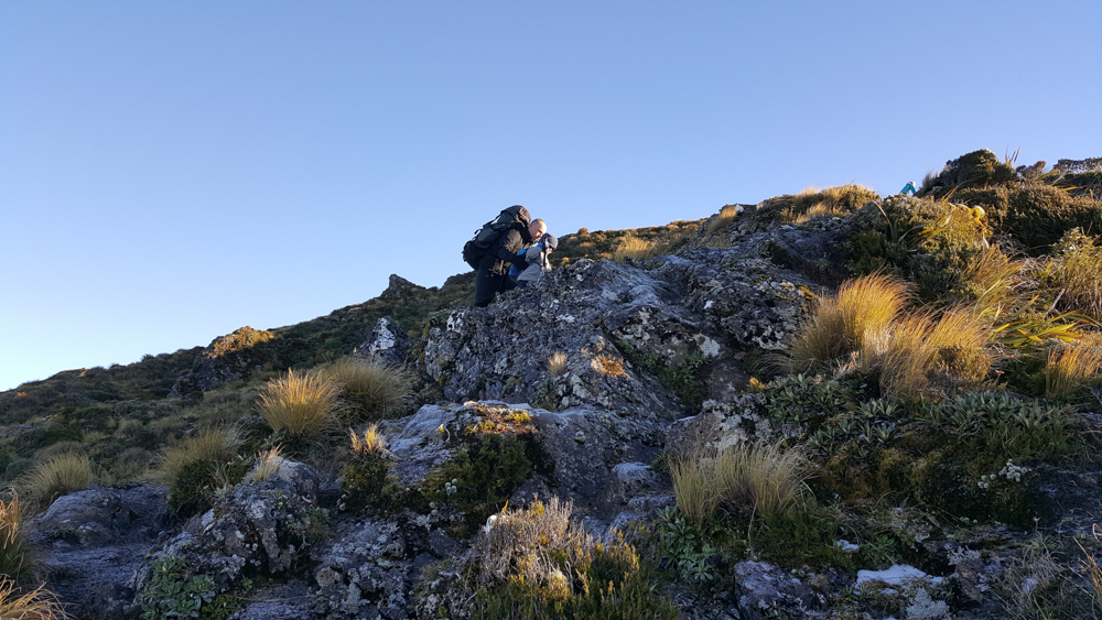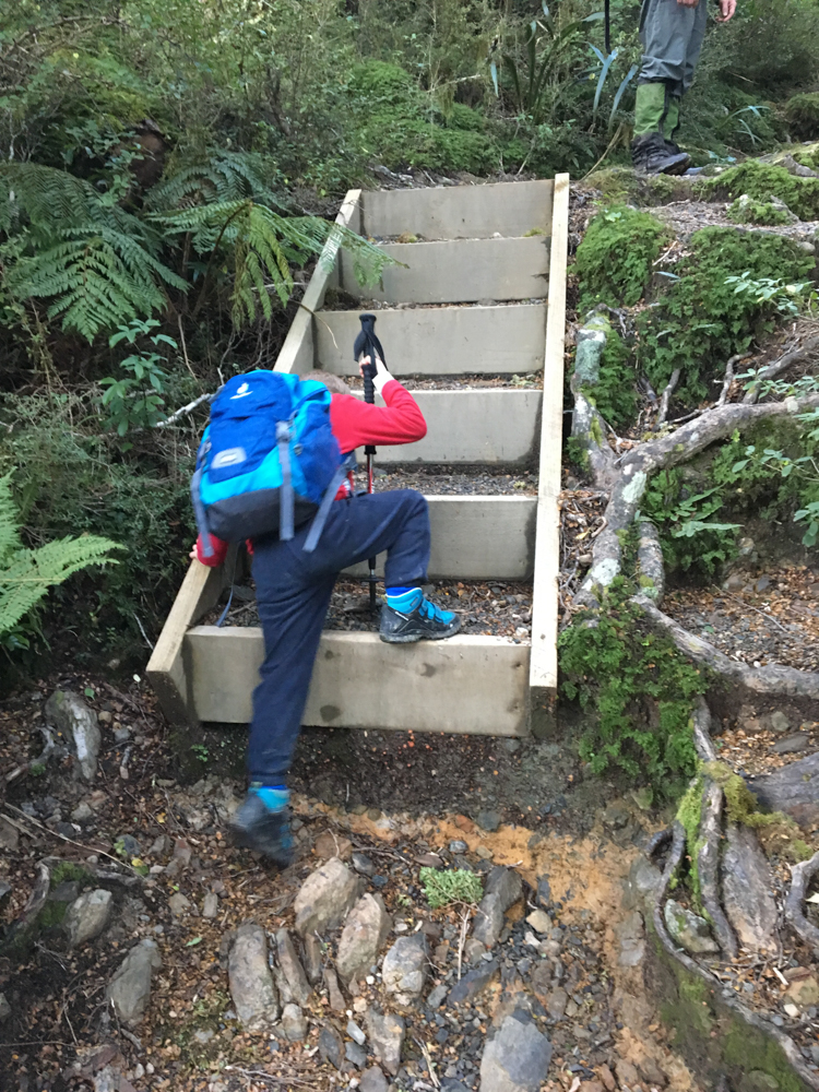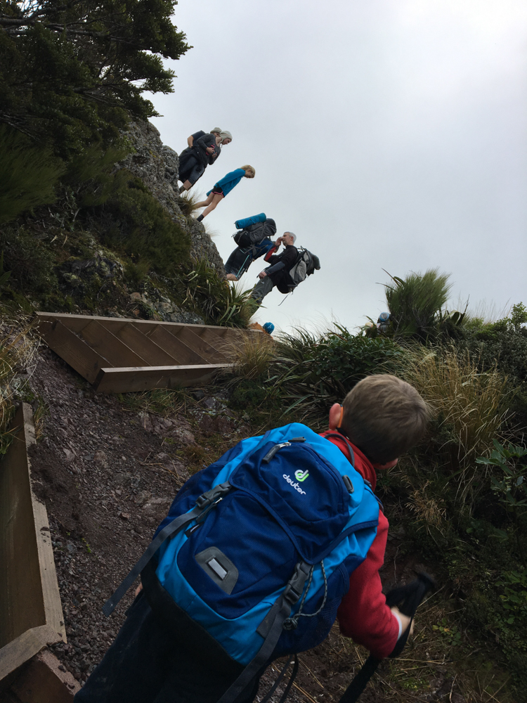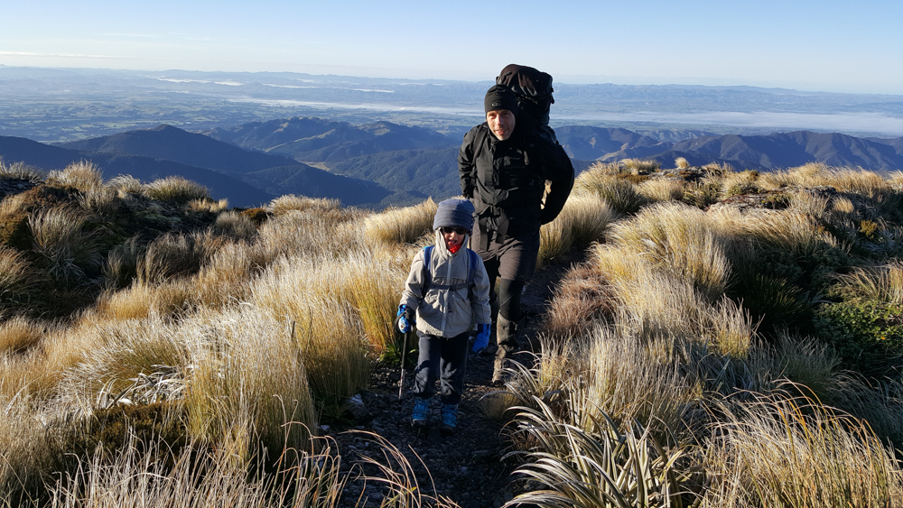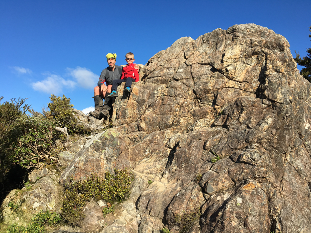 Puisqu'Adan avait pu gravir sans faillir la Kapiti Island (500 mètres de dénivelé positif), il nous était venu l'idée que peut-être, il pourrait se mesurer à l'ascension du Mont Holdworth, en haut duquel (enfin presque du moins) se trouve la Powell Hut. Pour se rendre à ce refuge très connu, 4 heures de marche sont nécessaires, le long d'un chemin bien balisé, et qui grimpe, quand même, de 900 mètres en tout. Gros Papa espérait un peu de neige, et de neige il n'y avait point. Par contre, l'admiration sans borne qu'il avait pour Adan a encore été décuplée! Cet album a été réalisé sans trucage, et aucun enfant n'a été maltraité lors du tournage (sans rire)!