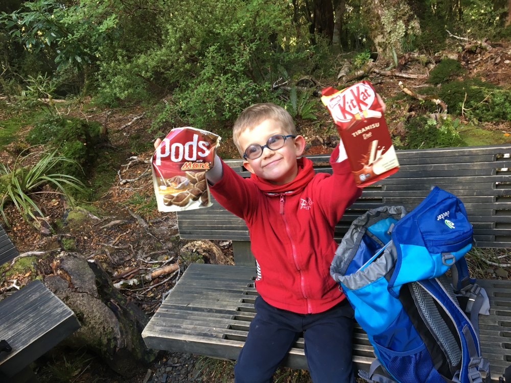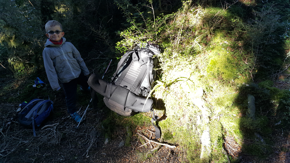 6. Un peu plus tard, on fait une pause. Adan commence à trainer un peu les pieds: c'est le moment de l'inviter à fouiller son sac ...