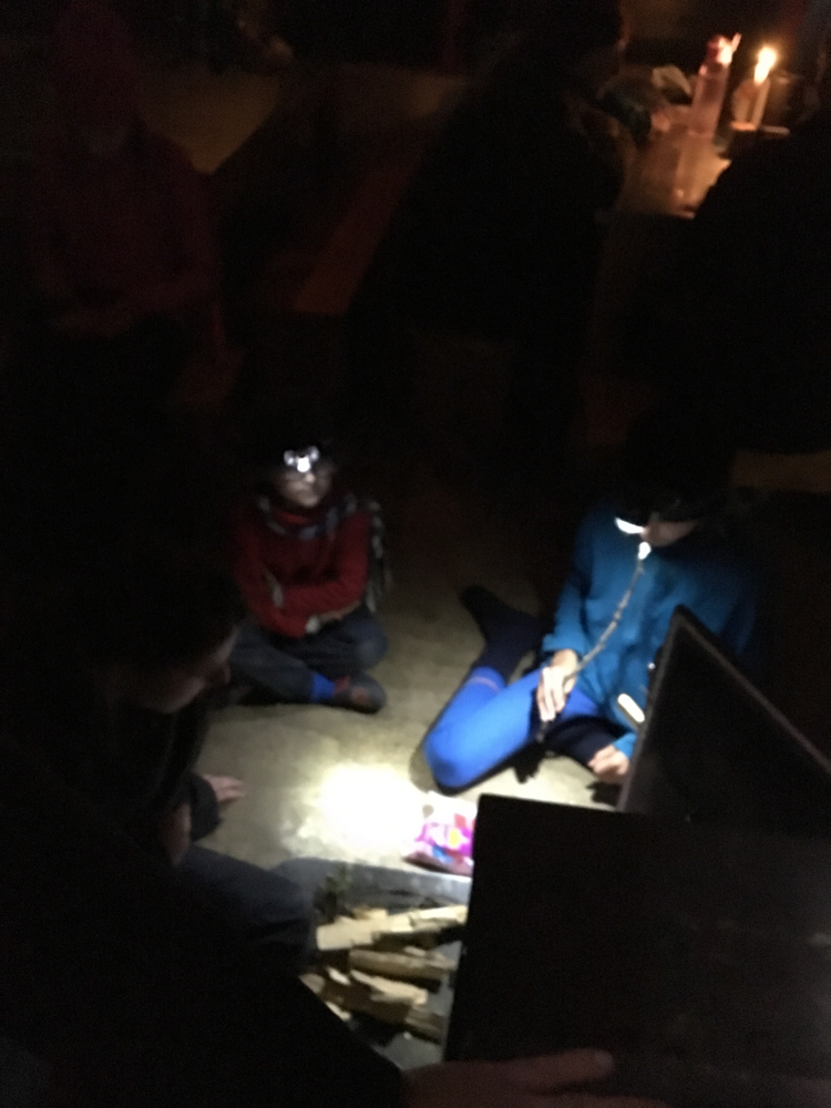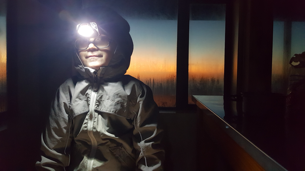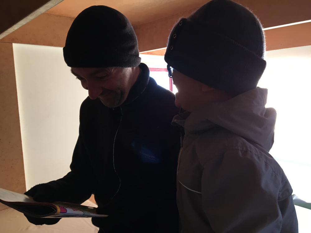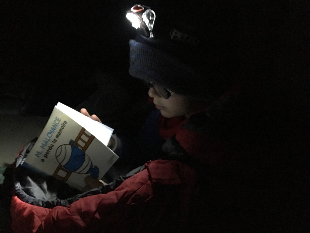 28. Puis, à la lumière de la lampe torche, dans son duvet, Adan va bouquiner un peu!