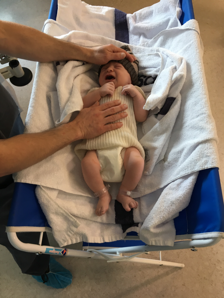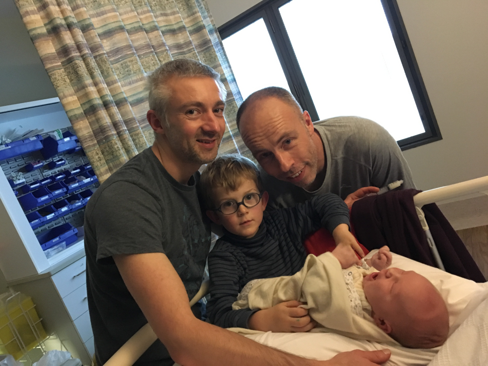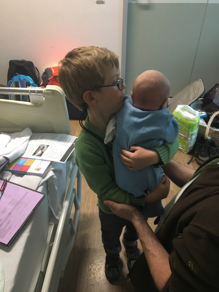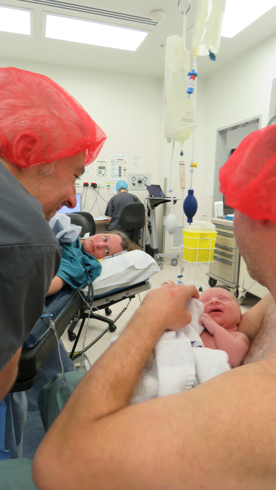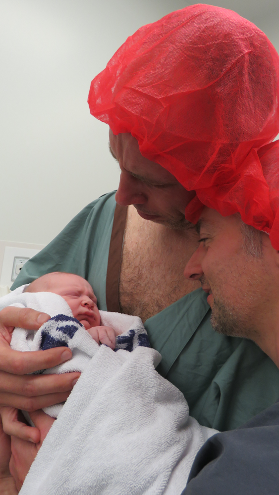 Le 13 août, à 11h50, naissait Cosmo, notre deuxième garçon. Grace à Melissa, nous avons complété notre famille, au cours d'un accouchement en plusieurs étapes: des cris dans la nuit a succédé un calme paisible, vers 4h du matin, quand la péridurale a été placée. Vers 11h, il a fallut se résoudre à une césarienne. Et pour cause: quand Cosmo a finalement poussé ses premiers cris, il pesait 5 kgs. Après les larmes de bonheur, nous avons repris notre souffle et nommé notre bébé. Melissa, la championne, a eu un peu chaud durant la césarienne, mais tout fut bien qui finit bien. Adan, quant à lui, fit connaissance de Cosmo vers 16h, et comme ses Papas, fut submergé de fierté!