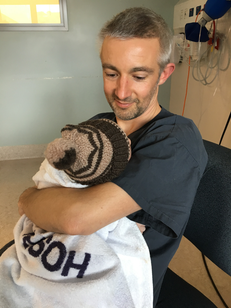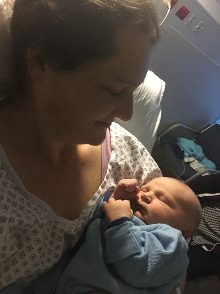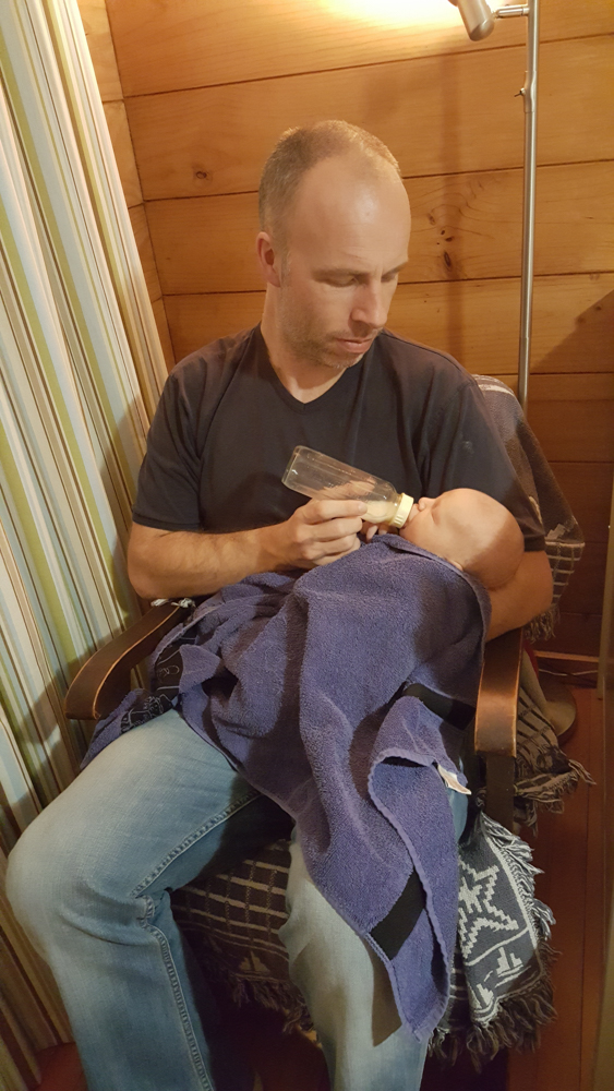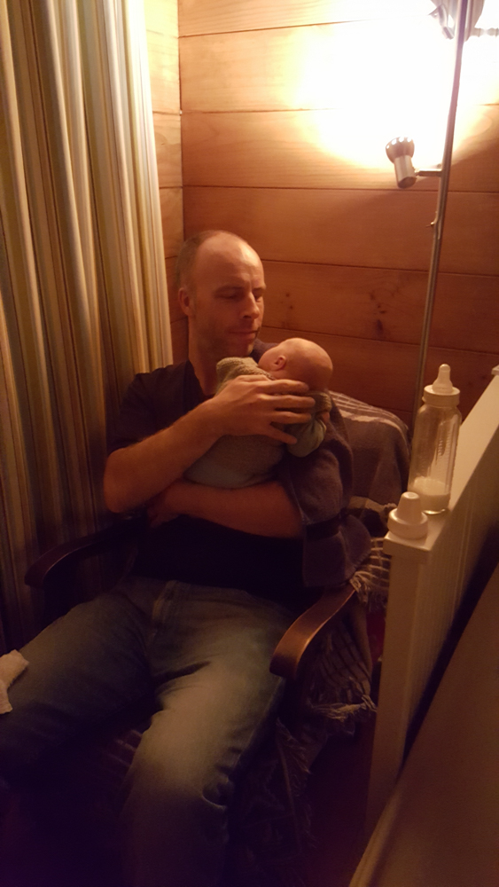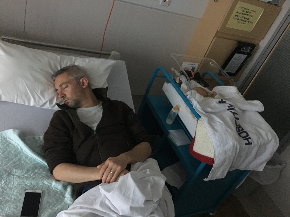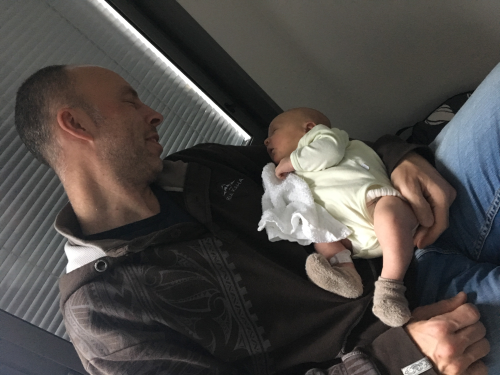 42. Lundi. Seb a dormi a l'hôpital ... et donc n'a pas dormi! Le collostrum est parti depuis longtemps, et on a déjà commencé à donner du lait (maternel) par petite dose et au biberon.