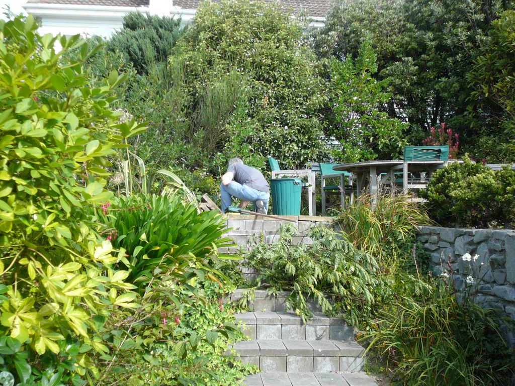 27. Il a ensuite resablé en dessous, nivelé, et reposé la terrasse.