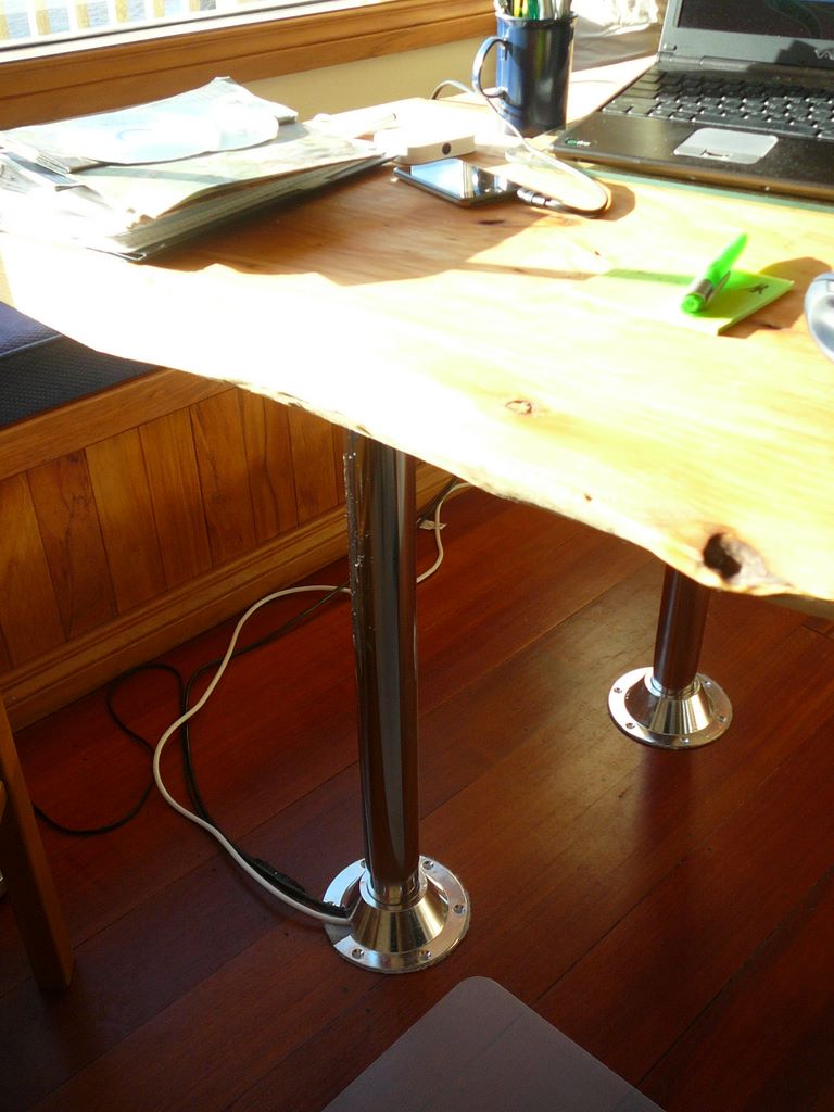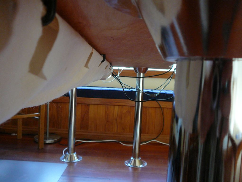 51. Les vrais pieds, les voici: des pieds de table de bateau, 4 au total, dont un que j'ai un peu découpé pour y faire passer les cables de nos ordinateurs.