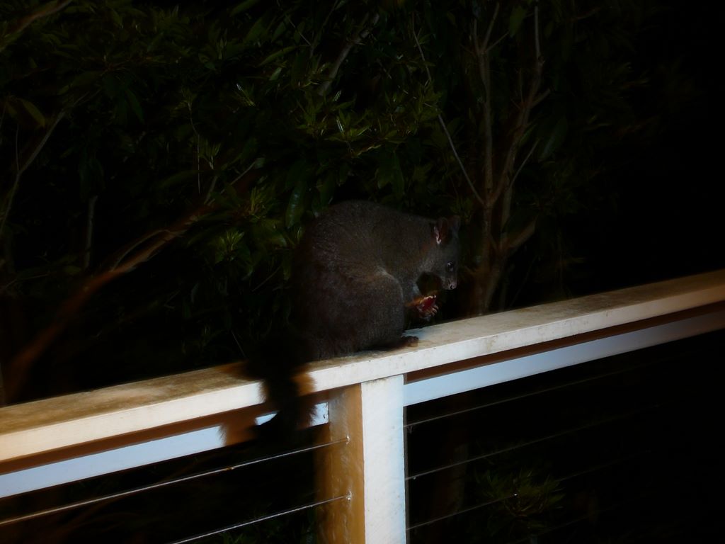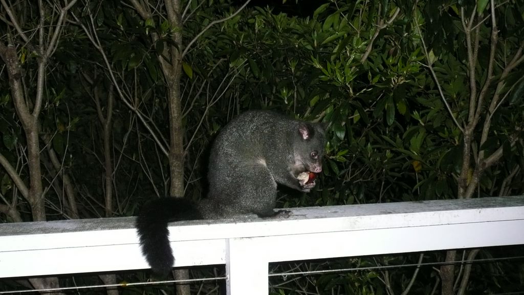 87. Le possum, sur la terrasse. En Nouvelle-Zélande, le possum est considéré comme une peste à éradiquer alors qu'ici, il est en danger et de fait, protégé.