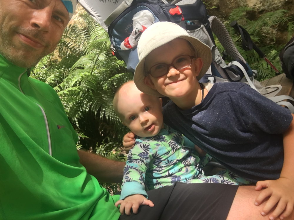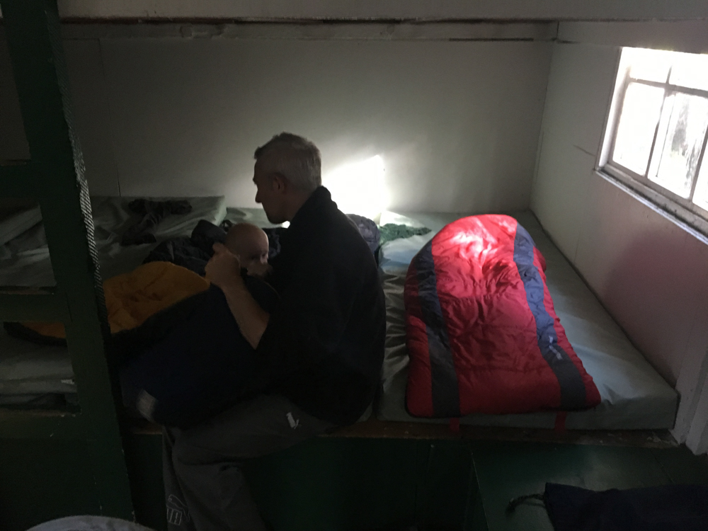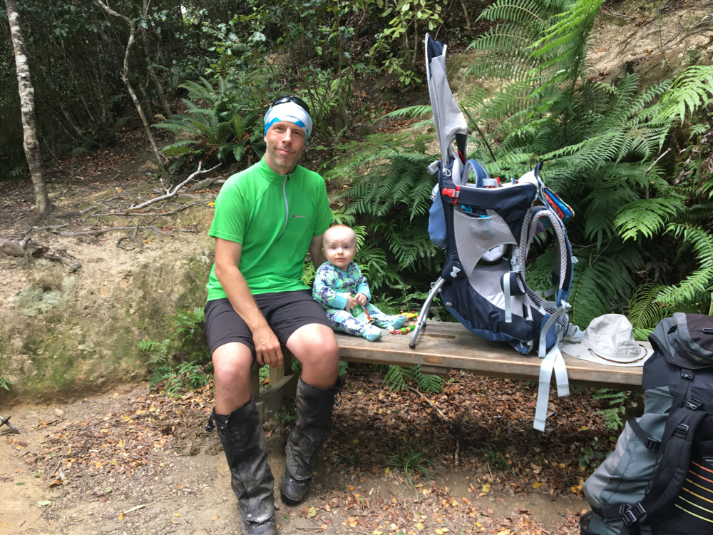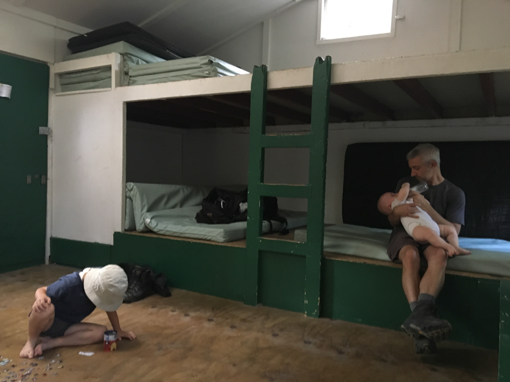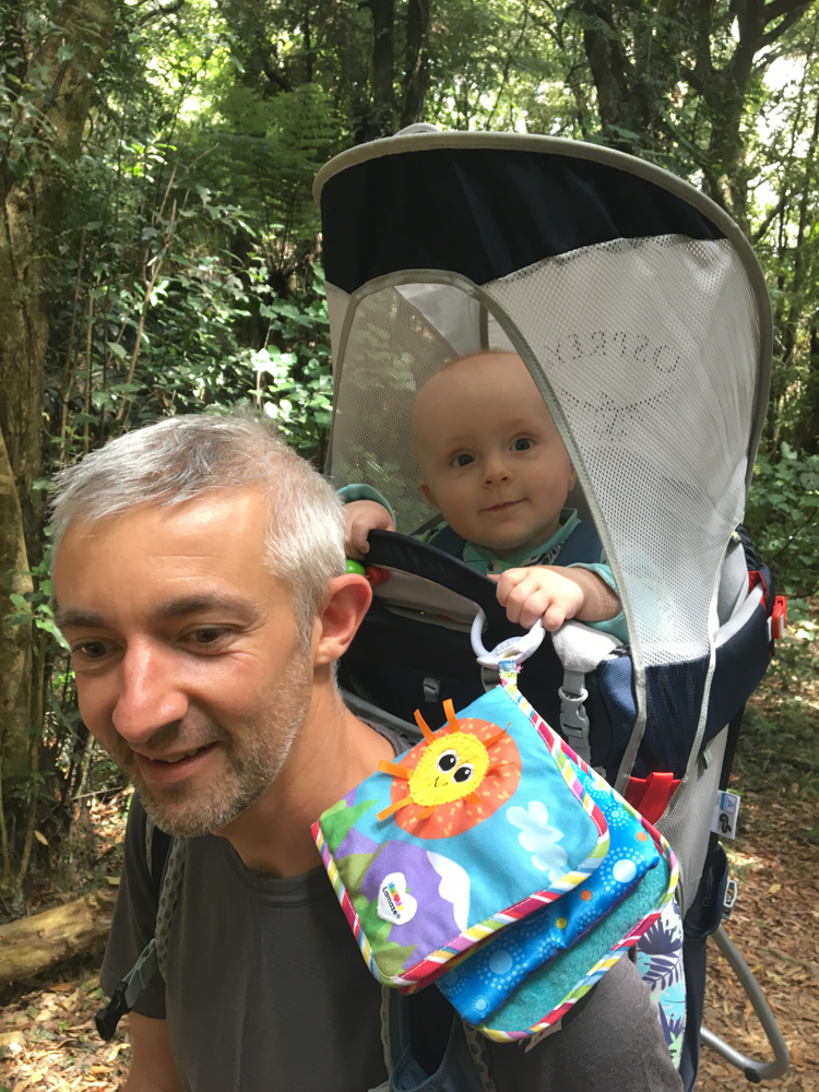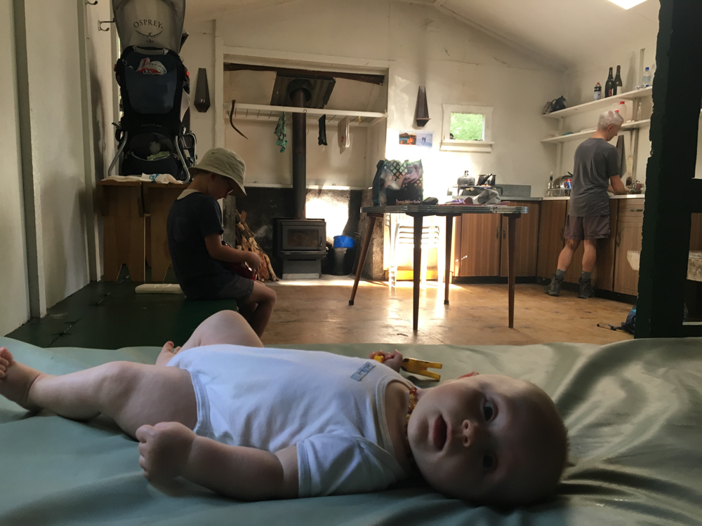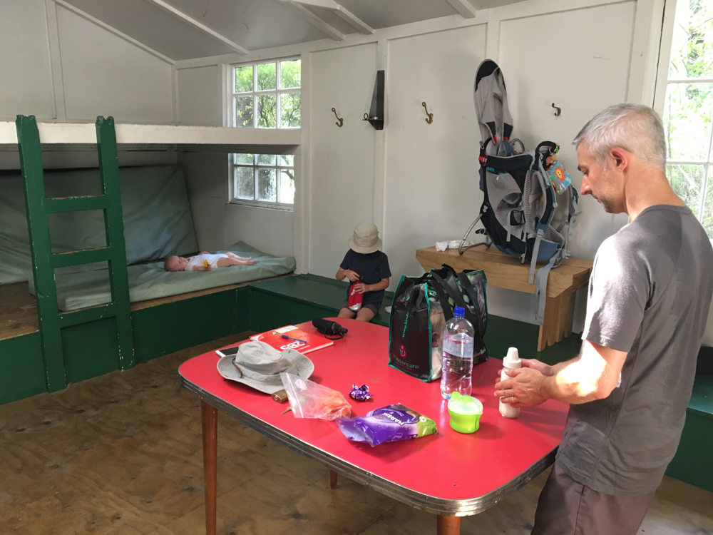 Jeudi, via une liste de diffusion dont je fais partie, nous apprenions que la Paua Hut etait disponible ce weekend pour ceux qui en voulaient. On l'a prise, en se disant: si ca degenere avec les enfants, c'est pas loin de la voiture, pas loin de Wellington, et on ne derangera personne. Samedi, nous sommes donc partis a 4 dans le Rimutaka, pour 3 heures de marche, dont une en riviere. Cosmo etait sur les epaules de Petit Papa, et le materiel pour toute la famille sur le dos de Gros Papa. Bien sur, Adan a mange cette "randonnade" sans probleme, et Cosmo a adore passer du temps en famille. Il a pionce un peu dans le sac, discute, observe la foret (qu'il caresse avec douceur), et bien rigole. La nuit venue, nous nous sommes tous couches sur la plateforme du bas du dortoir, et tout s'est bien passe (a part la respiration des enfants qui est plus fort qu'on pourrait le croire!). Seb et Adan ont meme ete convies a aller diner dans un refuge voisin pendant que Gros Papa s'occupait de Cosmo!