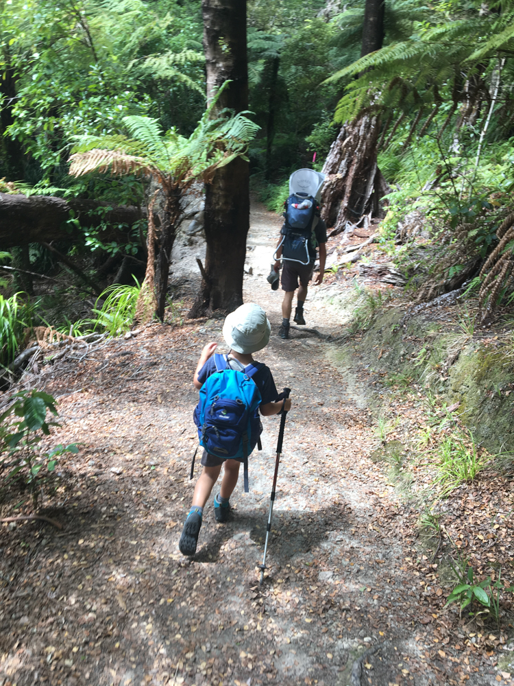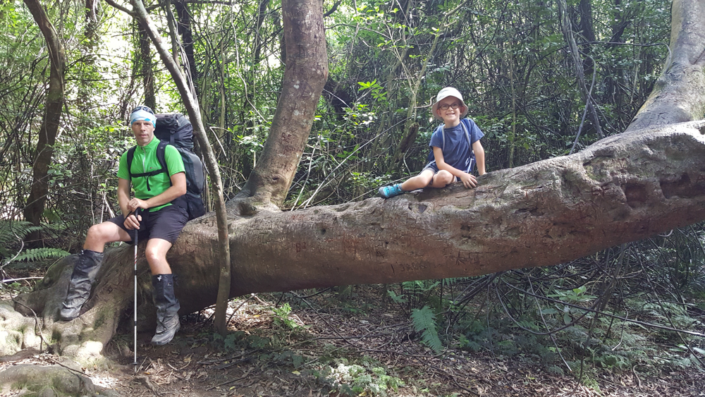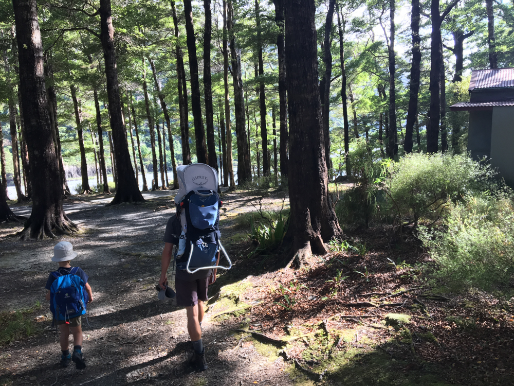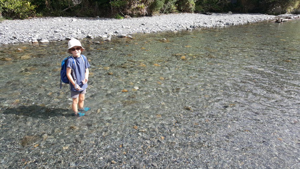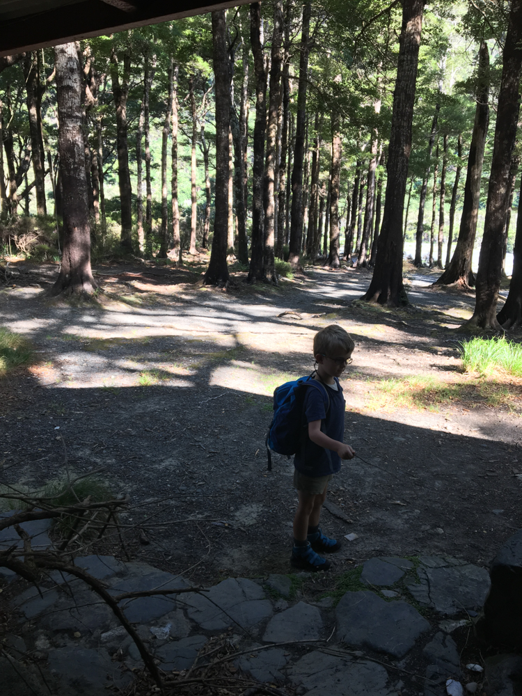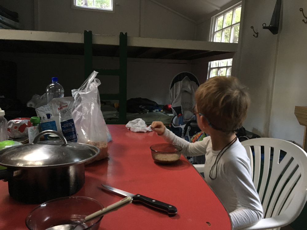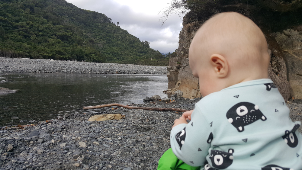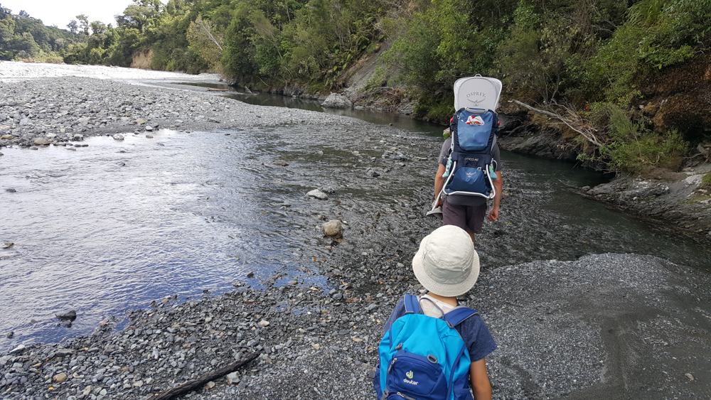 Jeudi, via une liste de diffusion dont je fais partie, nous apprenions que la Paua Hut etait disponible ce weekend pour ceux qui en voulaient. On l'a prise, en se disant: si ca degenere avec les enfants, c'est pas loin de la voiture, pas loin de Wellington, et on ne derangera personne. Samedi, nous sommes donc partis a 4 dans le Rimutaka, pour 3 heures de marche, dont une en riviere. Cosmo etait sur les epaules de Petit Papa, et le materiel pour toute la famille sur le dos de Gros Papa. Bien sur, Adan a mange cette "randonnade" sans probleme, et Cosmo a adore passer du temps en famille. Il a pionce un peu dans le sac, discute, observe la foret (qu'il caresse avec douceur), et bien rigole. La nuit venue, nous nous sommes tous couches sur la plateforme du bas du dortoir, et tout s'est bien passe (a part la respiration des enfants qui est plus fort qu'on pourrait le croire!). Seb et Adan ont meme ete convies a aller diner dans un refuge voisin pendant que Gros Papa s'occupait de Cosmo!